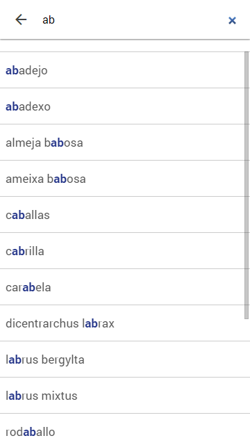 Disponible tanto en gallego como en castellano, permite seleccionar varias especies entre las siguientes categorías: bivalvos, cefalópodos, crustáceos, equinodermos, gasterópodos y pescados; y conocer, para cada una de esas especies: