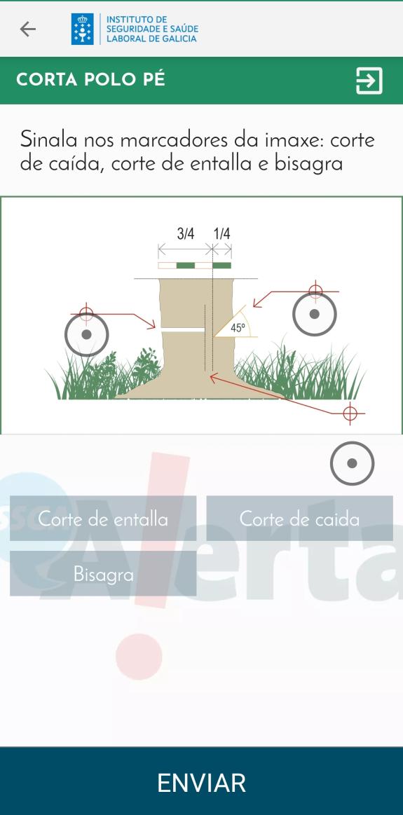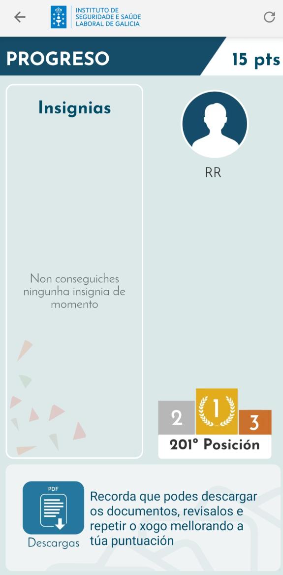 A app inclúe documentación especializada en seguridade e saúde laboral para a súa descarga, tests por actividade (árbores apoiadas, amianto...) e un ranking para competir con outros/as usuarios/as.
