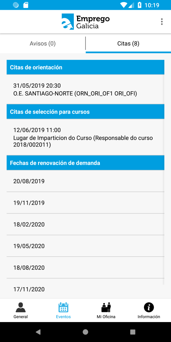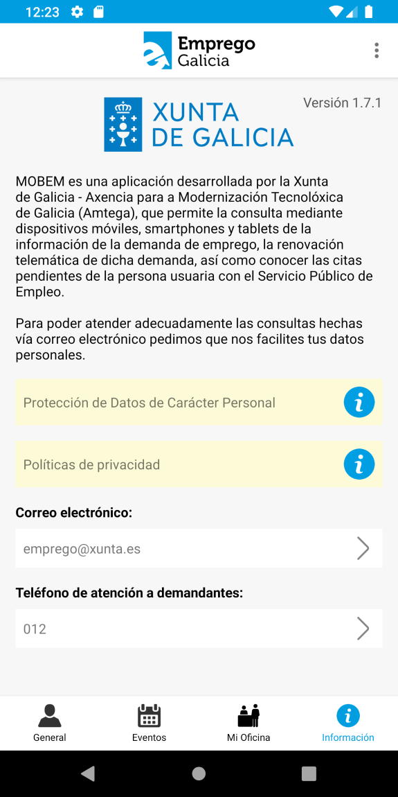 Aplicación dirigida a demandantes de empleo inscritos en el Servicio Público de Empleo de Galicia. Permite a la persona usuaria renovar la demanda de empleo, consultar sus citas de orientación laboral, las próximas fechas de renovación de demanda y las ofertas en las que es candidata.