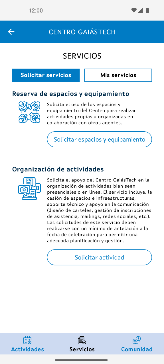 La aplicación del Centro GaiásTech permite a los usuarios registrados consultar e inscribirse en las actividades que se desarrollan en el centro: demostraciones tecnológicas, formación, divulgación y sensibilización, aceleración, sesiones temáticas, jornadas, sesiones sectoriales y sesiones locales.