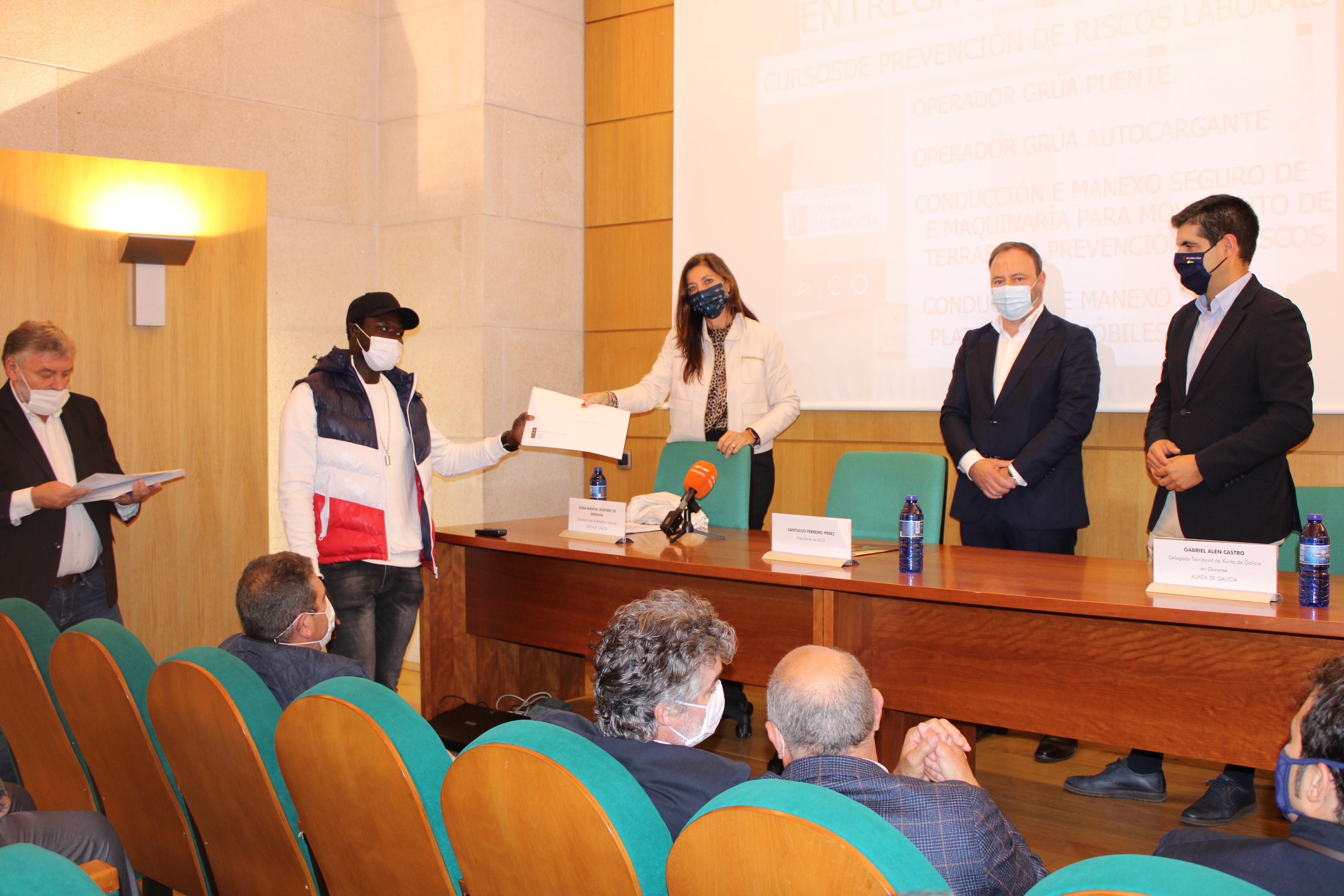 La directora general de Relaciones Laborales, Elena Mancha, y el delegado de la Xunta en Ourense, Gabriel Alén, participaron en la entrega de los diplomas a los participantes en cuatro cursos de formación en materia de prevención organizados por la Asociación Provincial de Empresarios de la Construcción de Ourense (ACO)