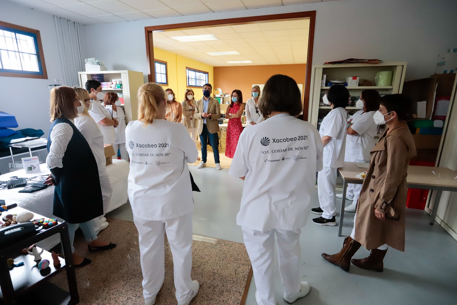 El delegado territorial, Luis López, acompañado de la alcaldesa de Ponteareas, Cristina Fernández, anuncia la resolución en una visita al Centro de Desarrollo Local en la que supervisó las actividades de la iniciativa laboral de la Xunta Cuidar de nosotros III