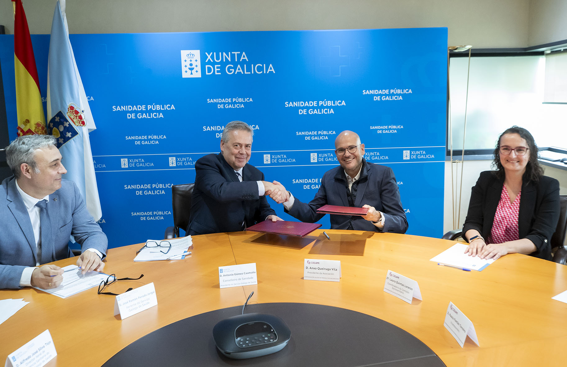 En el acto de firma estuvieron presentes el gerente del Servicio Gallego de Salud, José Ramón Parada; el director general de Asistencia Sanitaria del Sergas, Alfredo Silva; la coordinadora de la comisión sociosanitaria de Cogami, Laura Quintas; y el vicetesourero de la entidad, Paulo Fontán.