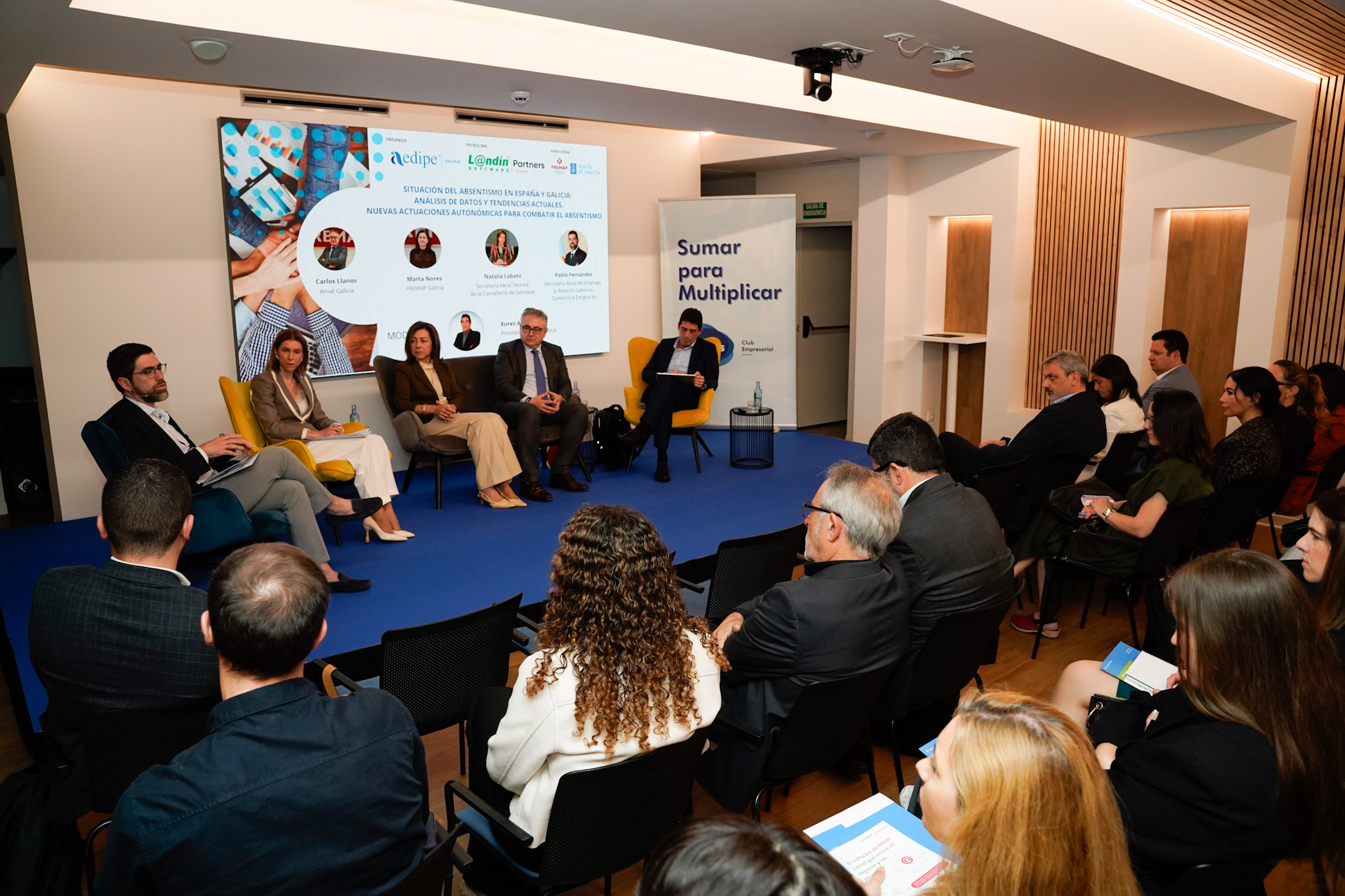 La secretaria general técnica de la Consellería de Sanidade, Natalia Lobato, y el secretario general de Empleo y Relaciones Laborales, Pablo Fernández, intervinieron en la `Jornada sobre absentismo laboral´ celebrada en el Noreste Club Empresarial de A Coruña