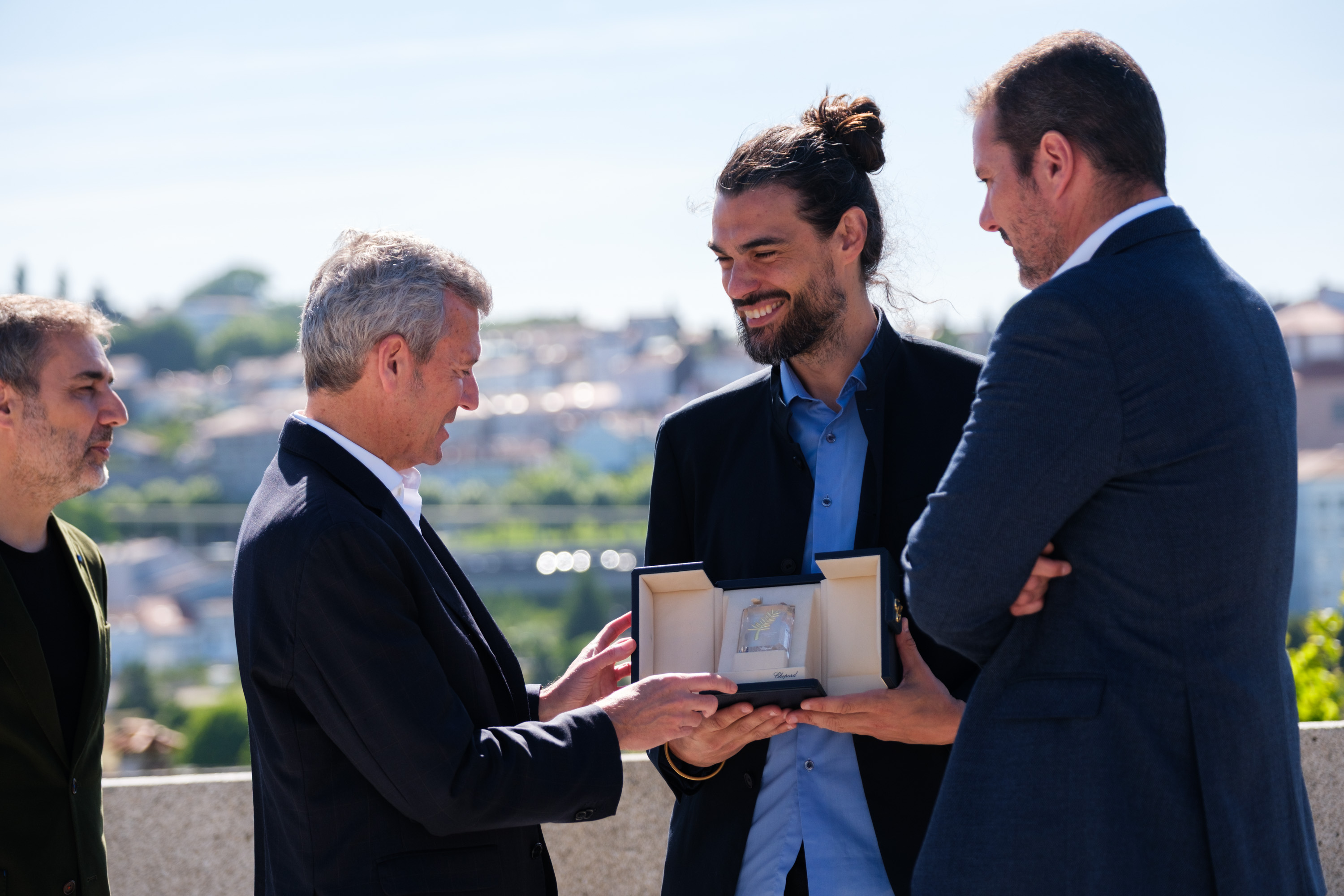El presidente de la Xunta, Alfonso Rueda, acompañado por el conselleiro de Cultura, Lingua e Xuventude, José López Campos, recibió esta mañana en Monte Pío al reciente premiado en el Festival de Cannes, Oliver Laxe. El director, guionista y actor gallego recibió este sábado por su película Sirat el Premio del Jurado, el tercer premio más prestigioso de este festival de cine.