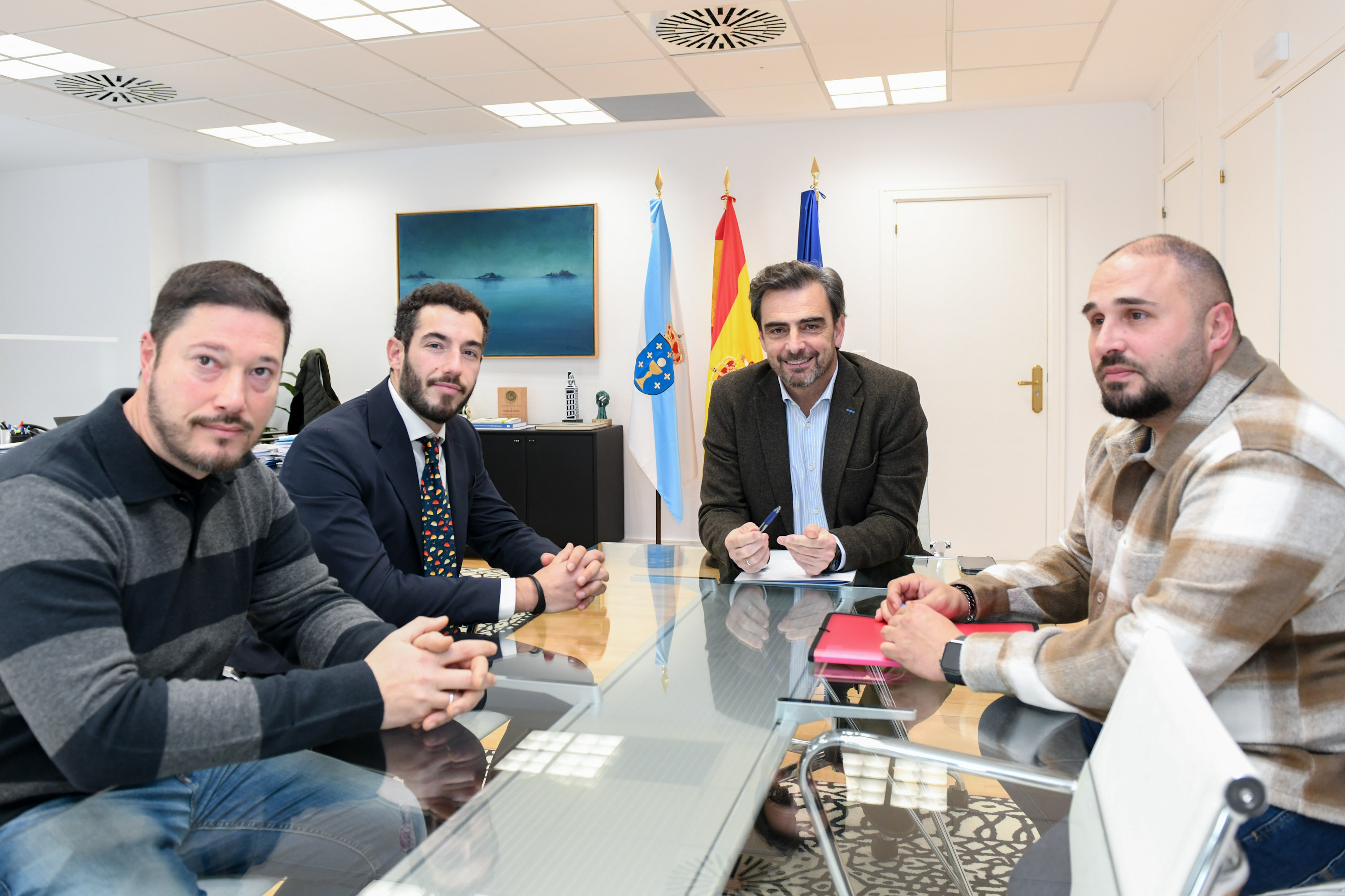 El conselleiro de Presidencia, Justicia y Deportes, Diego Calvo, se reunió esta mañana con el presidente de JuntosPolGC, Martín Rodríguez, y representantes de esta plataforma que integra a efectivos de la Policía Nacional y de la Guardia Civil.
