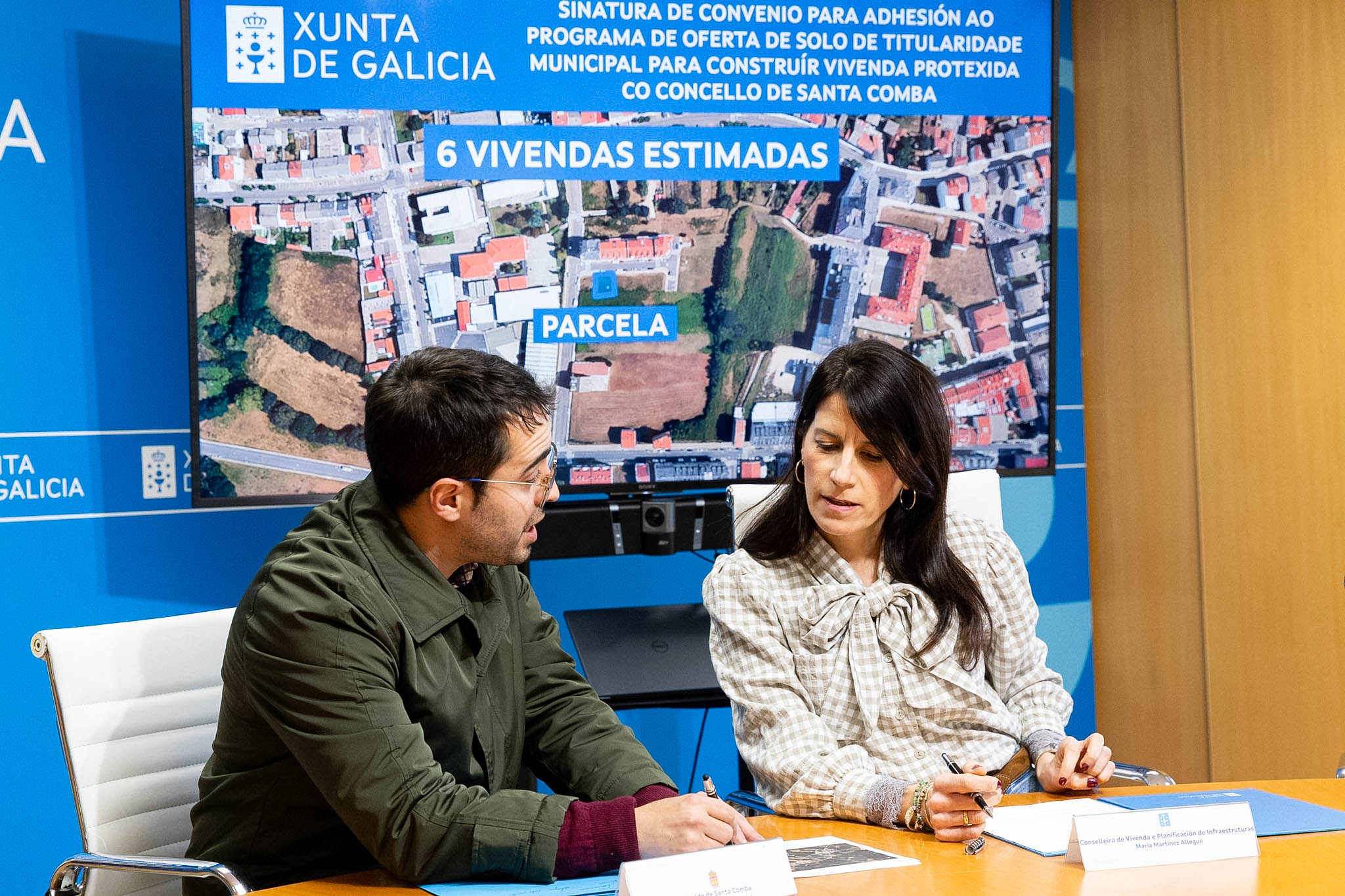 La conselleira de Vivenda e Planificación de Infraestruturas, María Martínez Allegue, junto con el secretario general técnico de la Consellería, Yago Borrajo, firmó esta tarde con el alcalde de Santa Comba, Alberto Romar, el convenio enmarcado en el Programa de oferta de suelo de titularidad de las entidades locales para la construcción de vivienda protegida en este municipio.