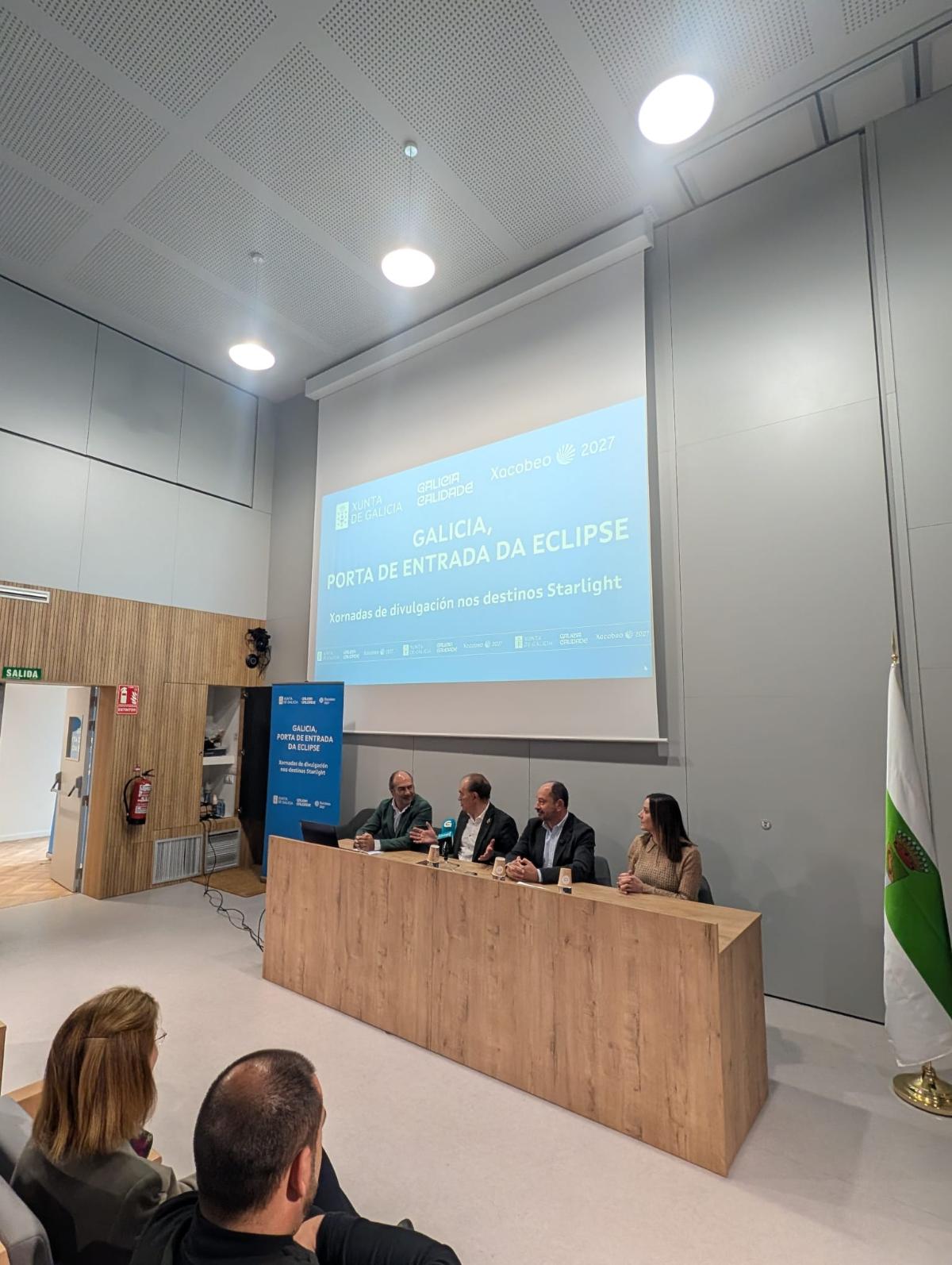 El director de Turismo de Galicia, Xosé Merelles, inauguró esta maná la ronda de jornadas de divulgación del eclipse en los destinos Starlight dirigidas al sector turístico de cada una de estas localizaciones. Durante su intervención, Xosé Merelles destacó la necesidad de una coordinación con los agentes locales de manera que se garantice una observación segura y ordenada de este fenómeno y si anticipen y coordinen todas las operaciones y traslados que se podan realizar en esas fechas. El director de Turismo subrayó que "la comunidad gallega es uno de los mejores lugares del mundo para su visualización".