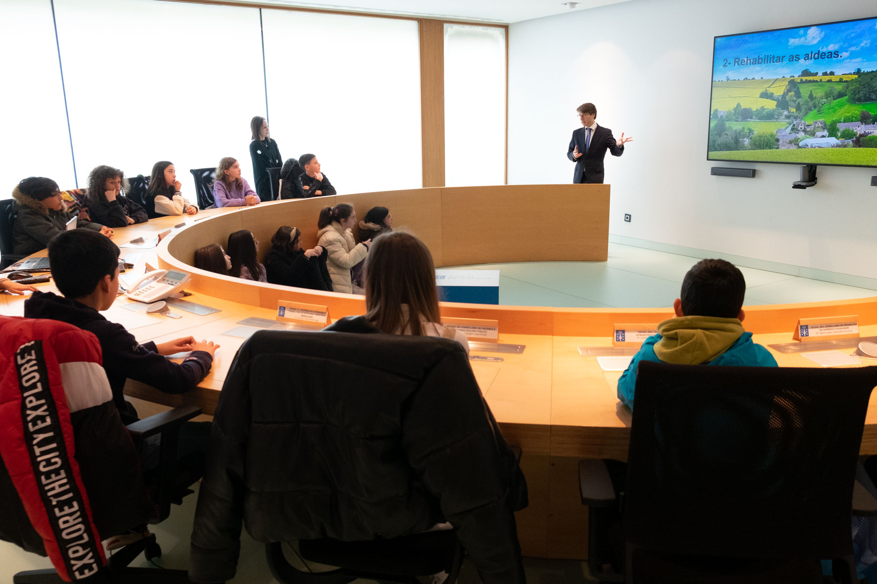 Miguel Corgos participa en una visita del alumnado del CEIP Monte dos Postes a la sala del Consello da Xunta dentro de la semana de la administración abierta