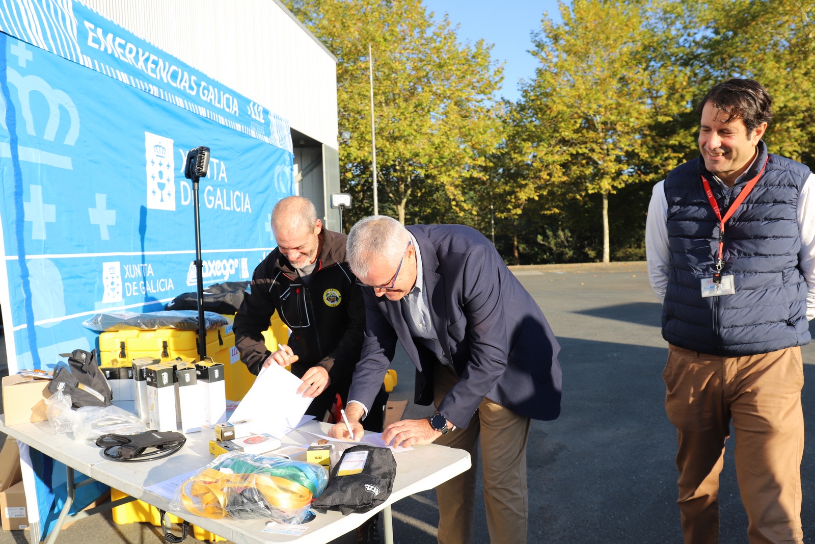 El director general de Emergencias e Interior, Santiago Villanueva, hizo entrega de un kit de material específico de rescate en altura, seis arcones, dos equipos de iluminación para áreas remotas y un generador eléctrico