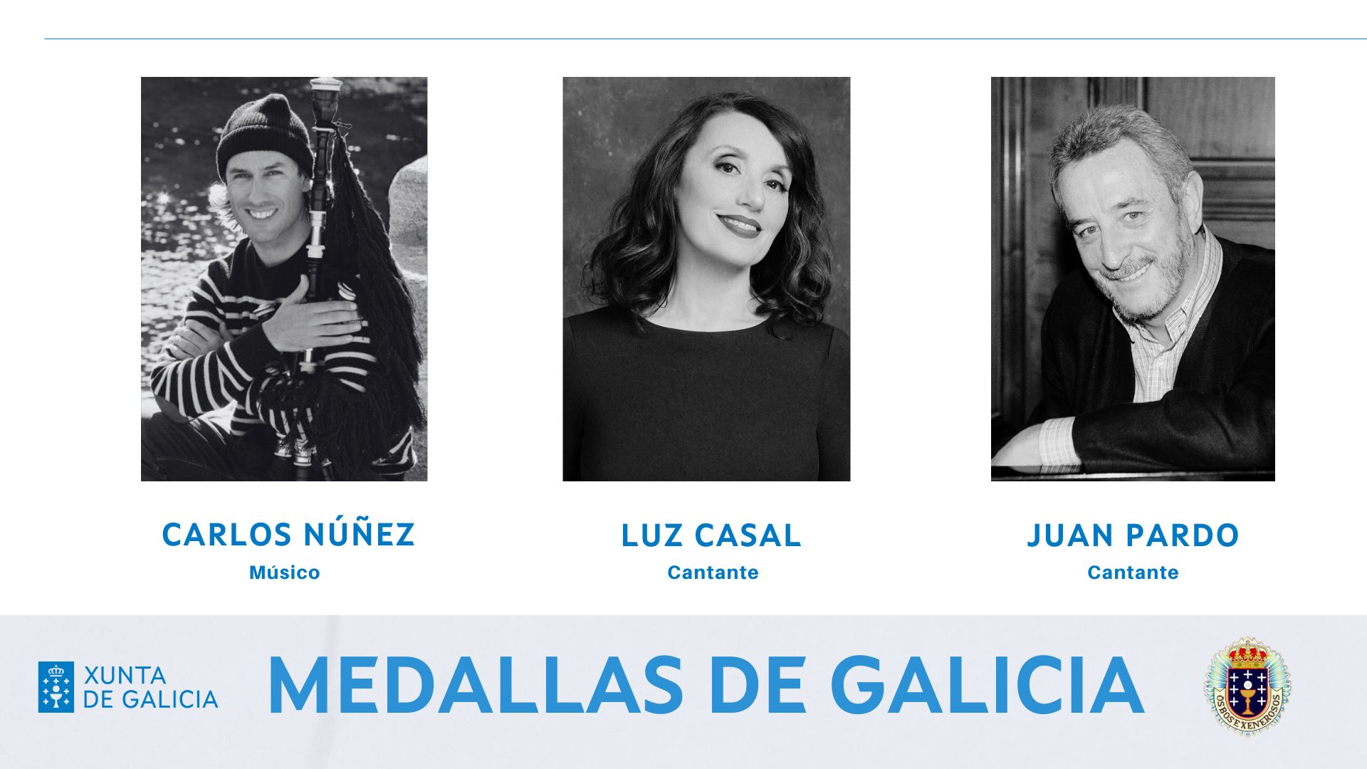 Rueda anuncia la concesión de las Medallas de Oro de Galicia de este año a los músicos Juan Pardo, Luz Casal y Carlos Núñez