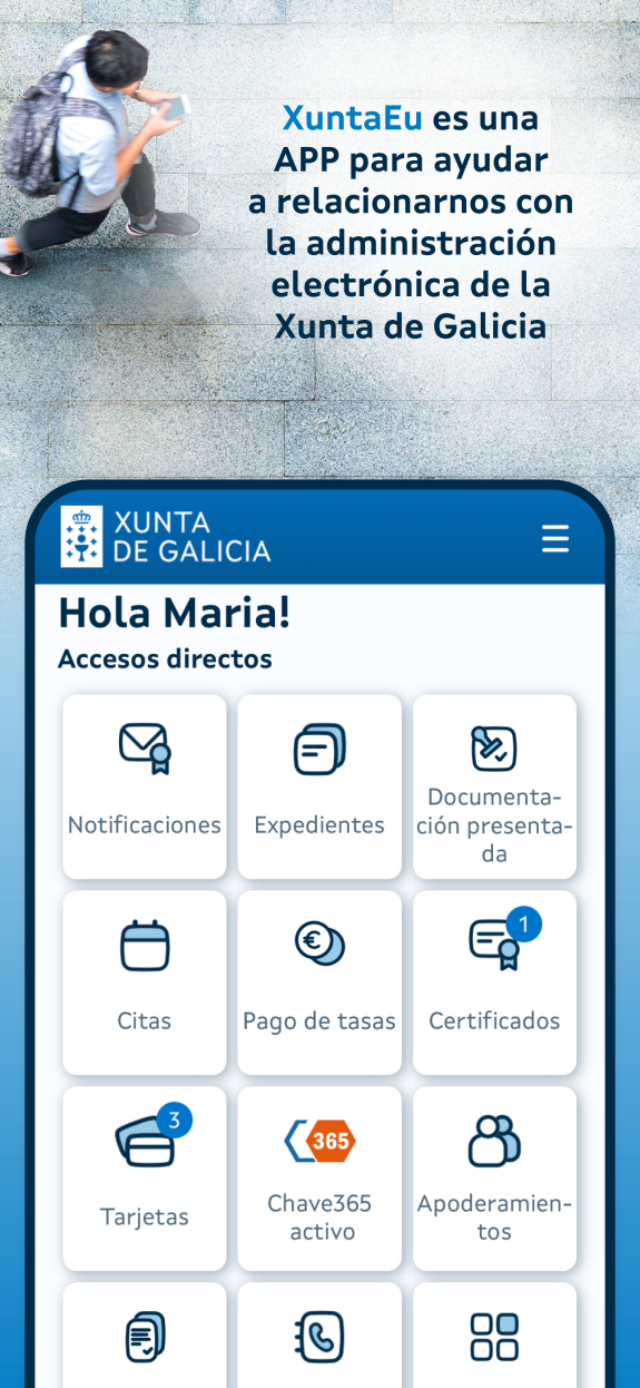 XuntaEu é unha app pensada para axudarche a relacionarte coa administración electrónica da Xunta de Galicia. Permite, entre outros servizos, xestionar o teu usuario de Chave365 (cambiar clave de acceso, renovala, modificar o teléfono móbil ou dárse de baixa), consultar expedientes e presentacións igual que na sede electrónica, consultar as túas notificacións electrónicas, outorgar apoderamentos, realizar o pago de taxas etc. Tamén se pode empregar para comprobar a validez dos documentos asinados electronicamente (CVE) ou consultar os teus certificados ou tarxetas para que os teñas sempre a man.