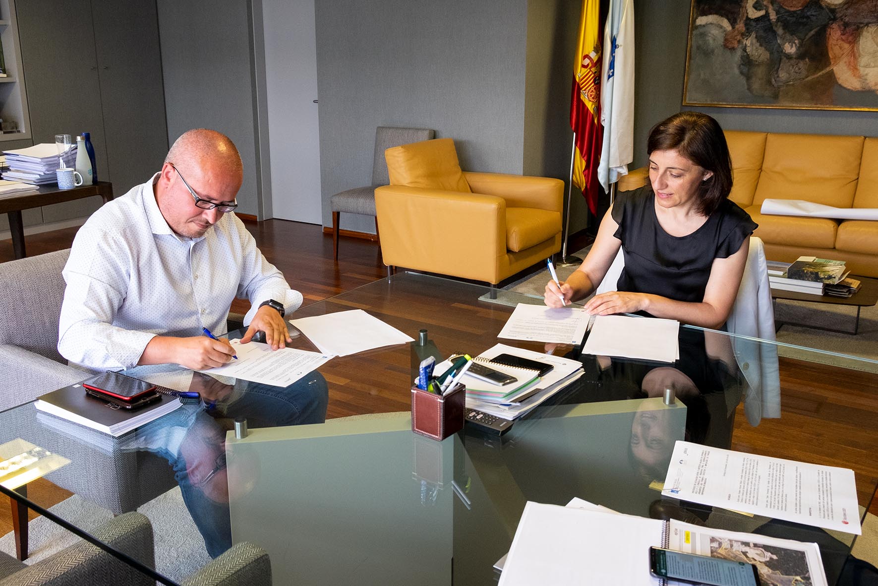 A conselleira de Medio Ambiente, Territorio e Vivenda, Ángeles Vázquez, trasladou esta mañá ao alcalde de Ribadavia, César Manuel Fernández Gil, a colaboración do Instituto Galego de Vivenda e Solo na ampliación do Polígono empresarial desta localidade. Así se recolle no protocolo de colaboración asinado esta mañá pola conselleira Vázquez e o rexedor municipal, polo cal o Concello de Ribadavia asumirá a modificación do plan parcial actual, co fin de adaptalo á normativa actual aplicable, así como as esixencias de sostibilidade requiridas.