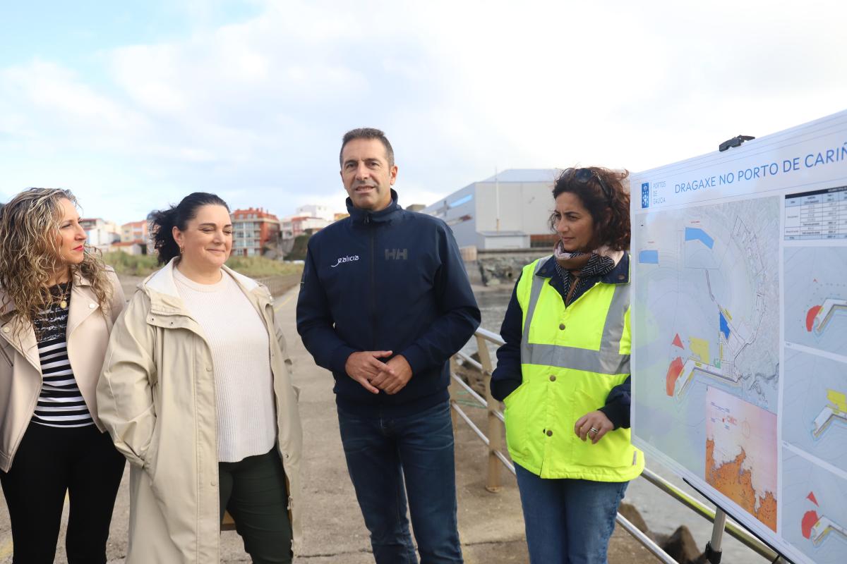 Villares, que estivo acompañado na visita pola delegada territorial da Xunta en Ferrol, Martina Aneiros, e polo presidente de Portos de Galicia, José Antonio Álvarez, explicou que os traballos deron comezo o pasado mes de setembro e permitirán extraer máis de 20.000 metros cúbicos de area para recuperar calado no porto de Cariño. En concreto actuarase en dúas zonas, a rampla de varada e a zona dos peiraos de atracada comercial interiores.