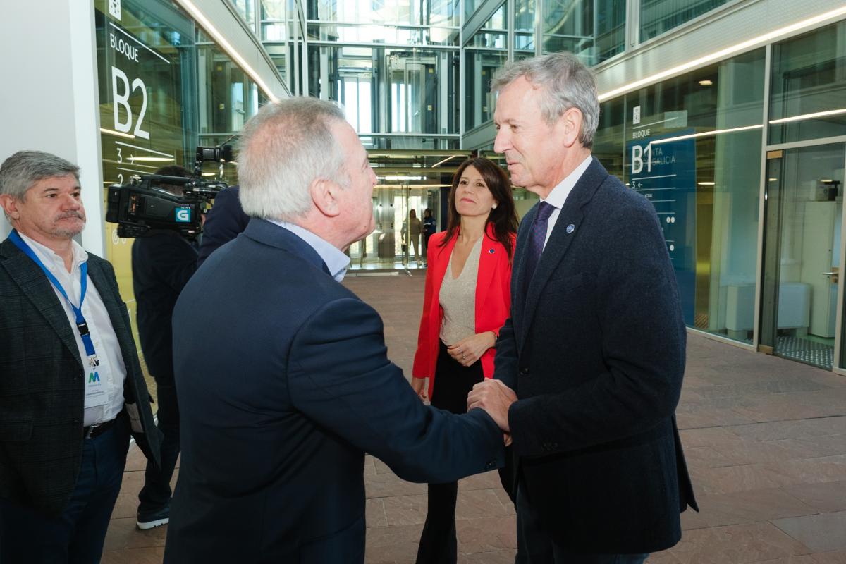 O presidente da Xunta, Alfonso Rueda, acompañado pola conselleira de Vivenda e Planificación de Infraestruturas, María Martínez Allegue, salientou hoxe a aposta do Executivo galego polo aproveitamento sustentable do sector madeireiro en Galicia e pola progresiva incorporación da madeira ás novas edificacións públicas.