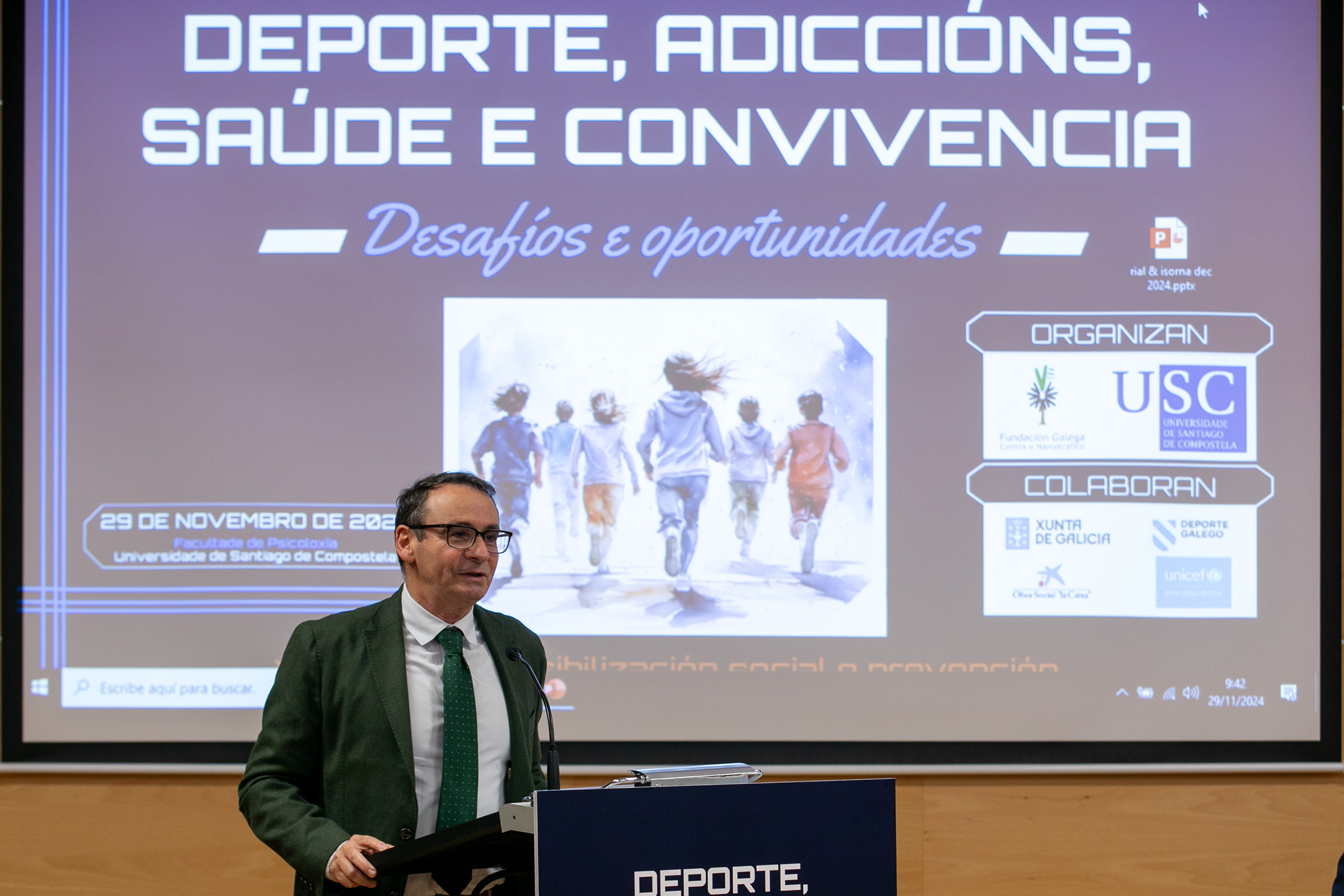 O director xeral de Xustiza, José Tronchoni, participou na inauguración da xornada ‘Deporte, adiccións, saúde e convivencia’, organizada pola Fundación Galega contra o Narcotráfico e a Universidade de Santiago de Compostela co apoio da Xunta