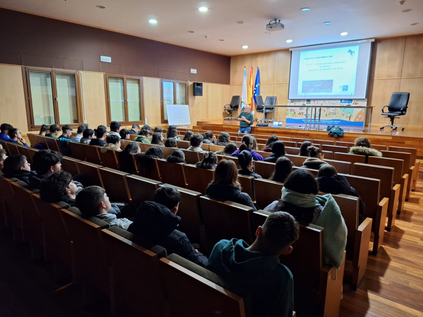 Por outro lado, máis de 40 alumnos dos ciclos de FP de Gandaría e Asistencia en Sanidade e de Produción Agroecolóxica asistiron á charla “O descanso das vacas”, incluída no programa “A Ponte” da Universidade de Santiago de Compostela. Esta actividade estivo impartida por Ramiro Fouz, profesor da Facultade de Veterinaria do Campus de Lugo, que expuxo a importancia que ten un descanso apropiado das vacas no seu benestar e produción, relatando polo miúdo as razóns fisiolóxicas deste feito.
