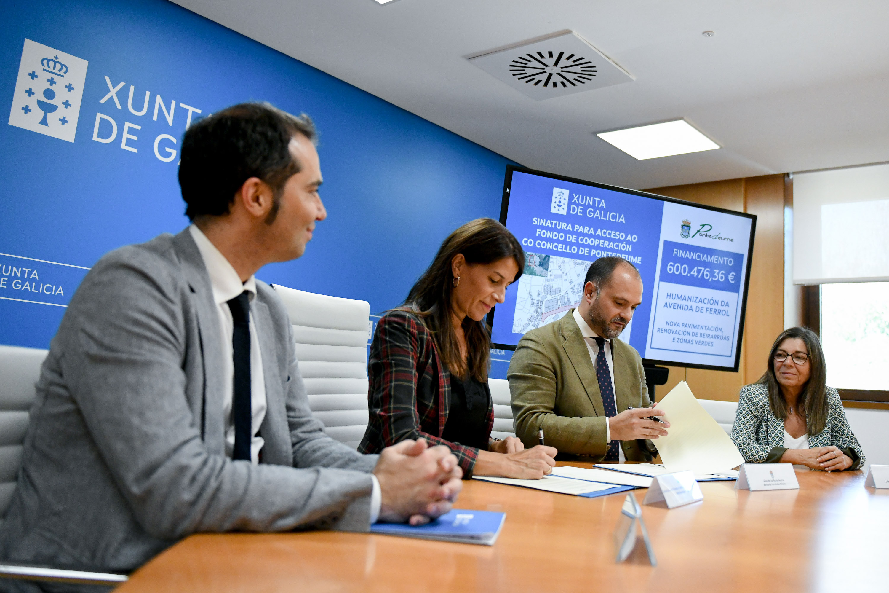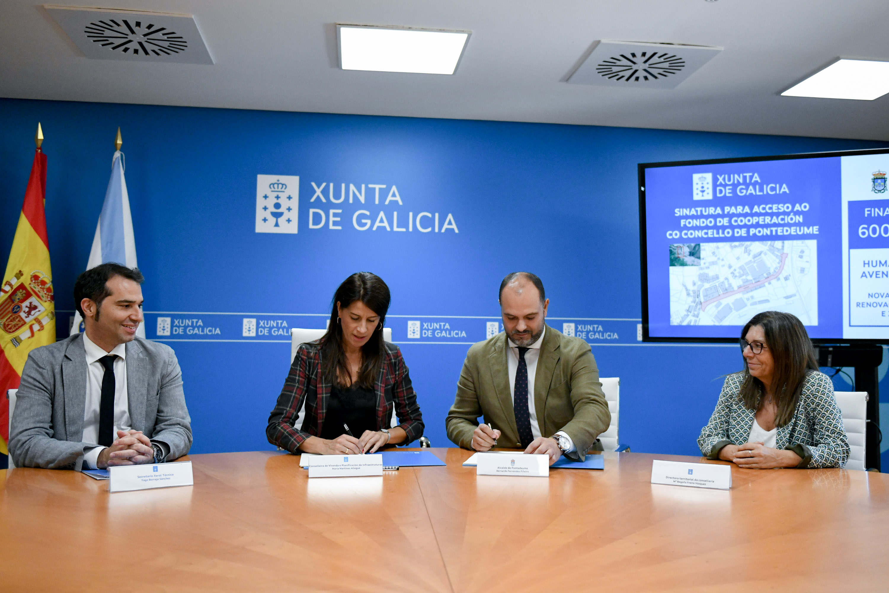 A conselleira de Vivenda e Planificación de Infraestruturas, María M. Allegue, xunto co secretario xeral técnico, Yago Borrajo, asinou co alcalde de Pontedeume, Bernardo Fernández Piñeiro, o convenio para a concesión dun préstamo por un importe total de 600.476,36 euros do Fondo de Cooperación da Xunta para municipios de menos de 50.000 habitantes.