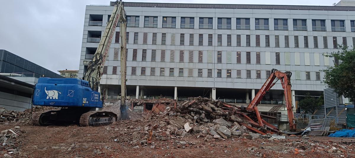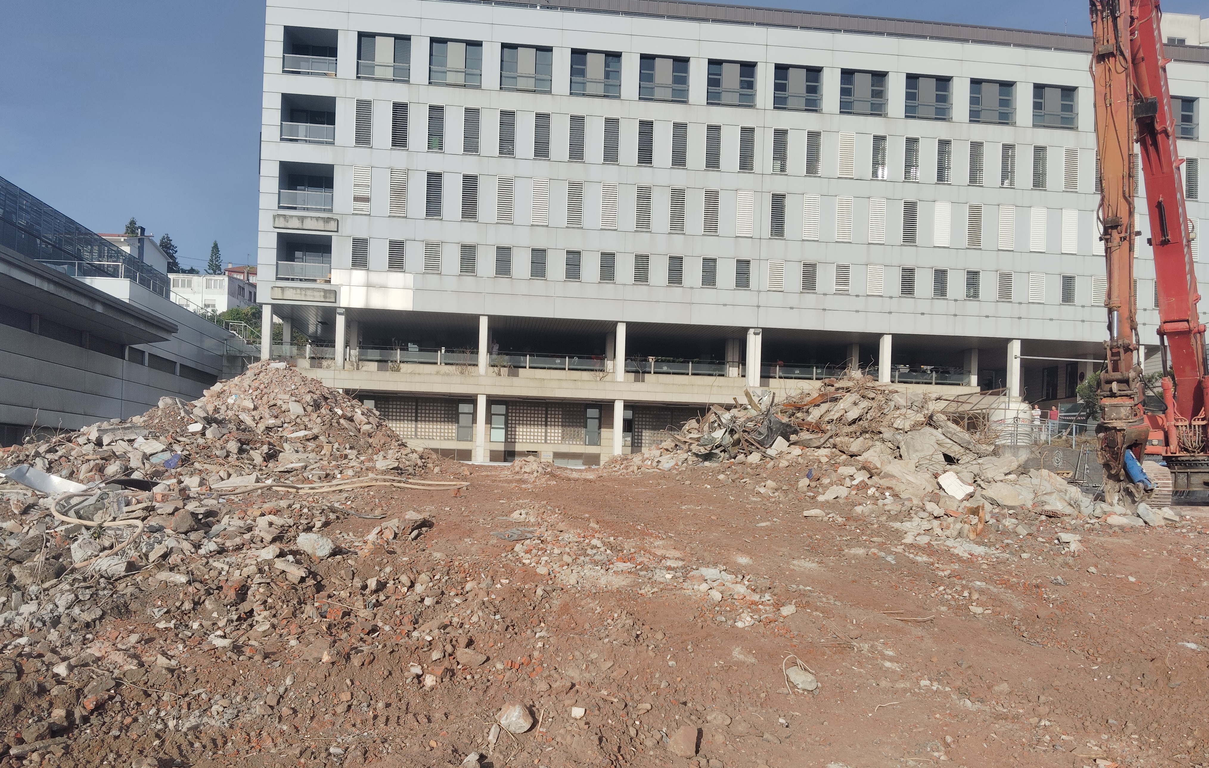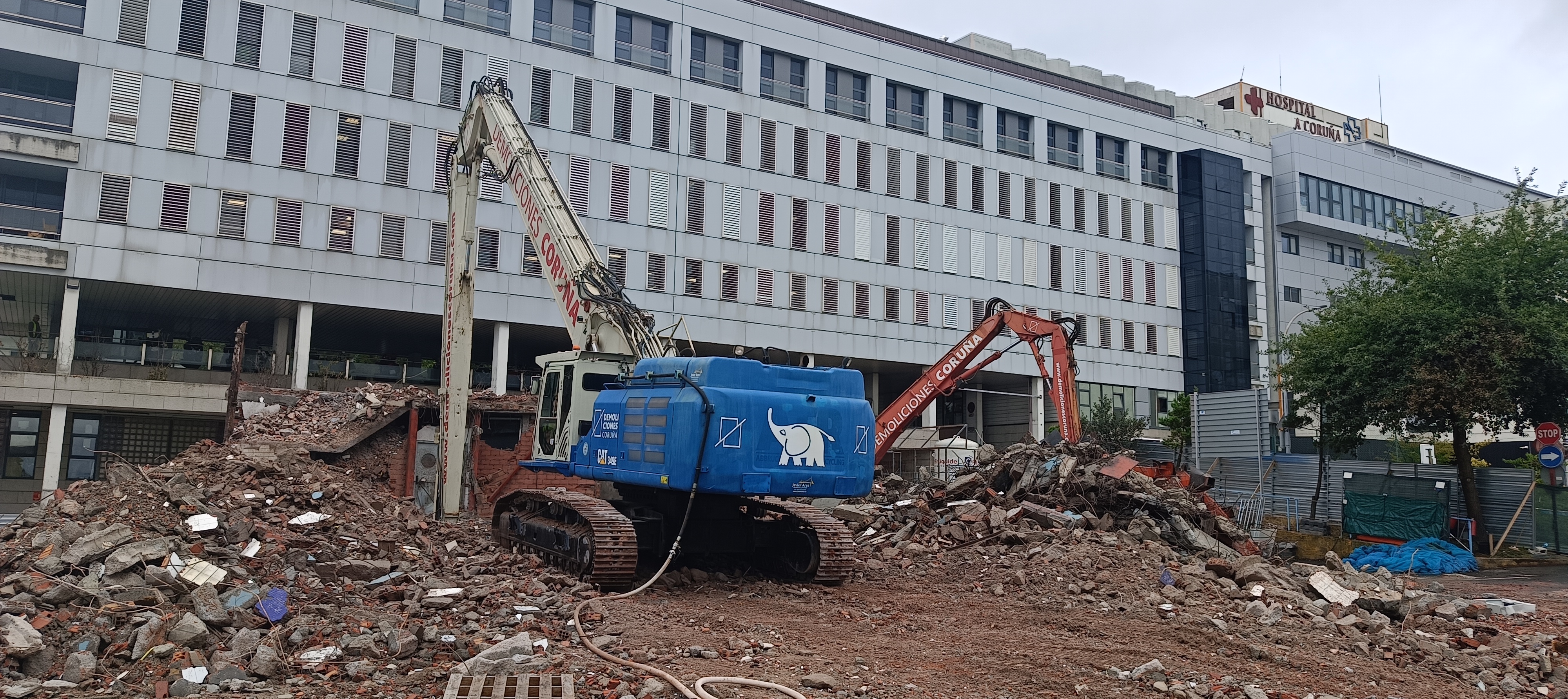 A demolición realizouse elemento a elemento para minimizar o impacto dos traballos na contorna, debido á proximidade dos edificios asistenciais do complexo sanitario, e cumprindo un estrito plan de bioseguridade para controlar a emisión de po e ruído.