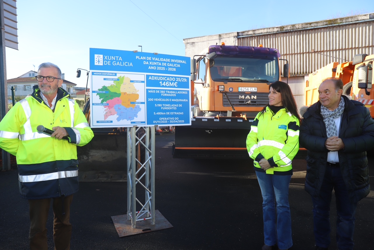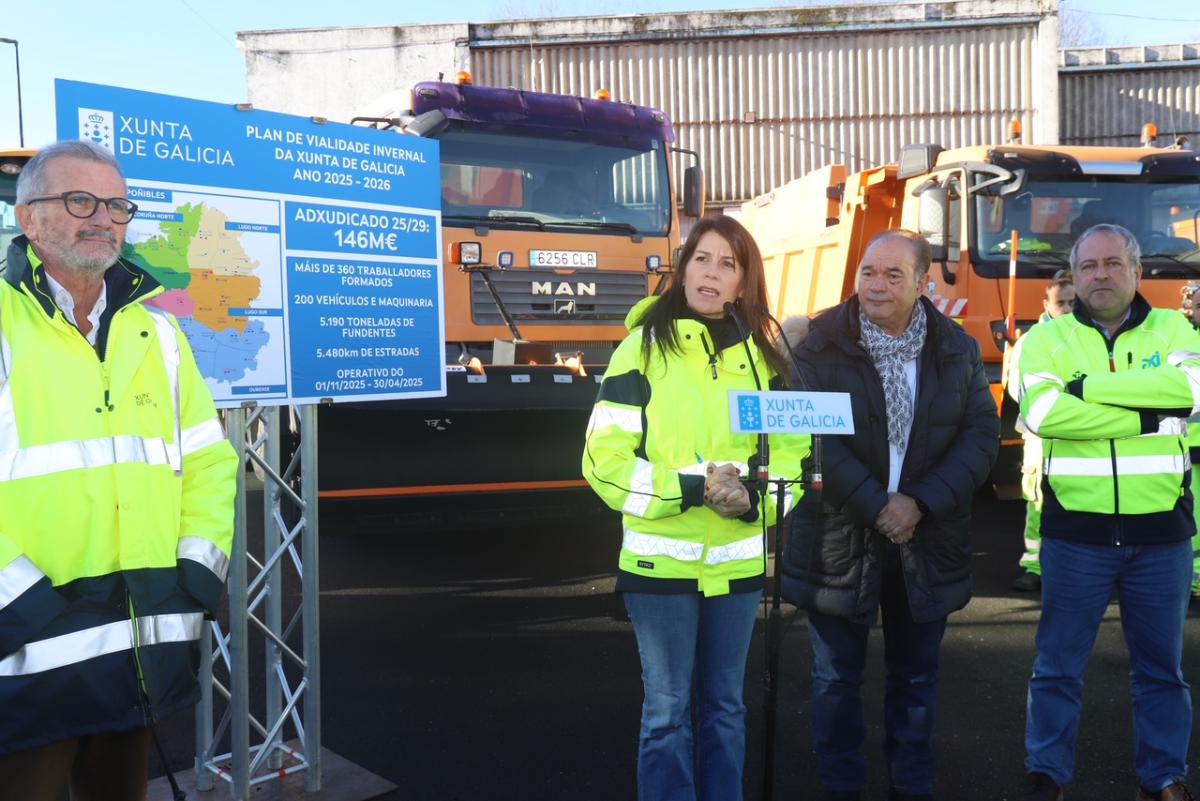 A Xunta xa ten en marcha o Plan de Vialidade Invernal 2025-2026, cun operativo que implica a máis de 350 traballadores e a disposición de 5.190 toneladas de fundente s. A conselleira de Vivenda e Planificación de Infraestruturas, María M. Allegue, visitou hoxe en Lalín un dos 23 centros desde os que a Administración autonómica desprega este operativo nas catro provincias.