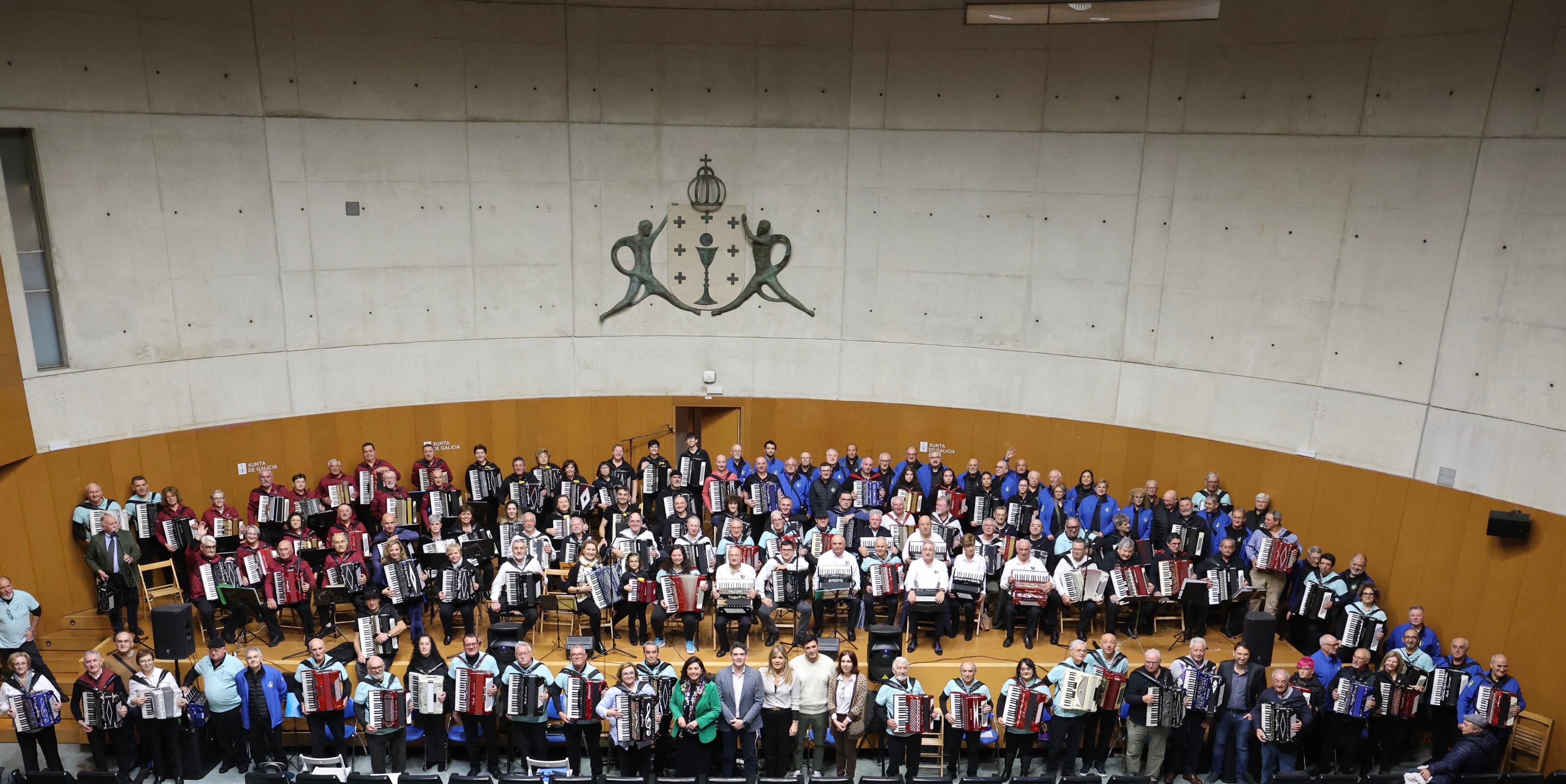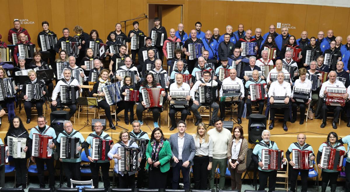 O delegado territorial, Javier Arias, asistiu esta mañá á actuación conxunta que ofreceron os máis de 160 acordeonistas das 12 agrupacións participantes no encontro, que chegaron de distintos puntos de Galicia, Asturias e Castela e León. Entre elas, está a lucense Terras do Miño, formada por músicos que superan os 60 anos de idade, e que colaborou co Goberno galego na organización deste orixinal evento.