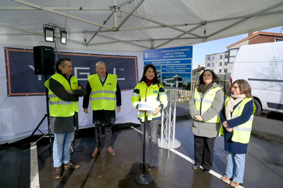 A Xunta concedeu no 2025 axudas a dúas cooperativas, por un importe total dun millón de euros, para a construción de 108 vivendas protexidas en Oleiros. A conselleira de Vivenda e Planificación de Infraestruturas, María M. Allegue, xunto á delegada territorial da Xunta na Coruña, Belén do Campo, visitou hoxe as obras da promoción que unha das cooperativas beneficiadas, A Canteira de Perillo, está a construír para 21 vivendas, das que 16 son protexidas.