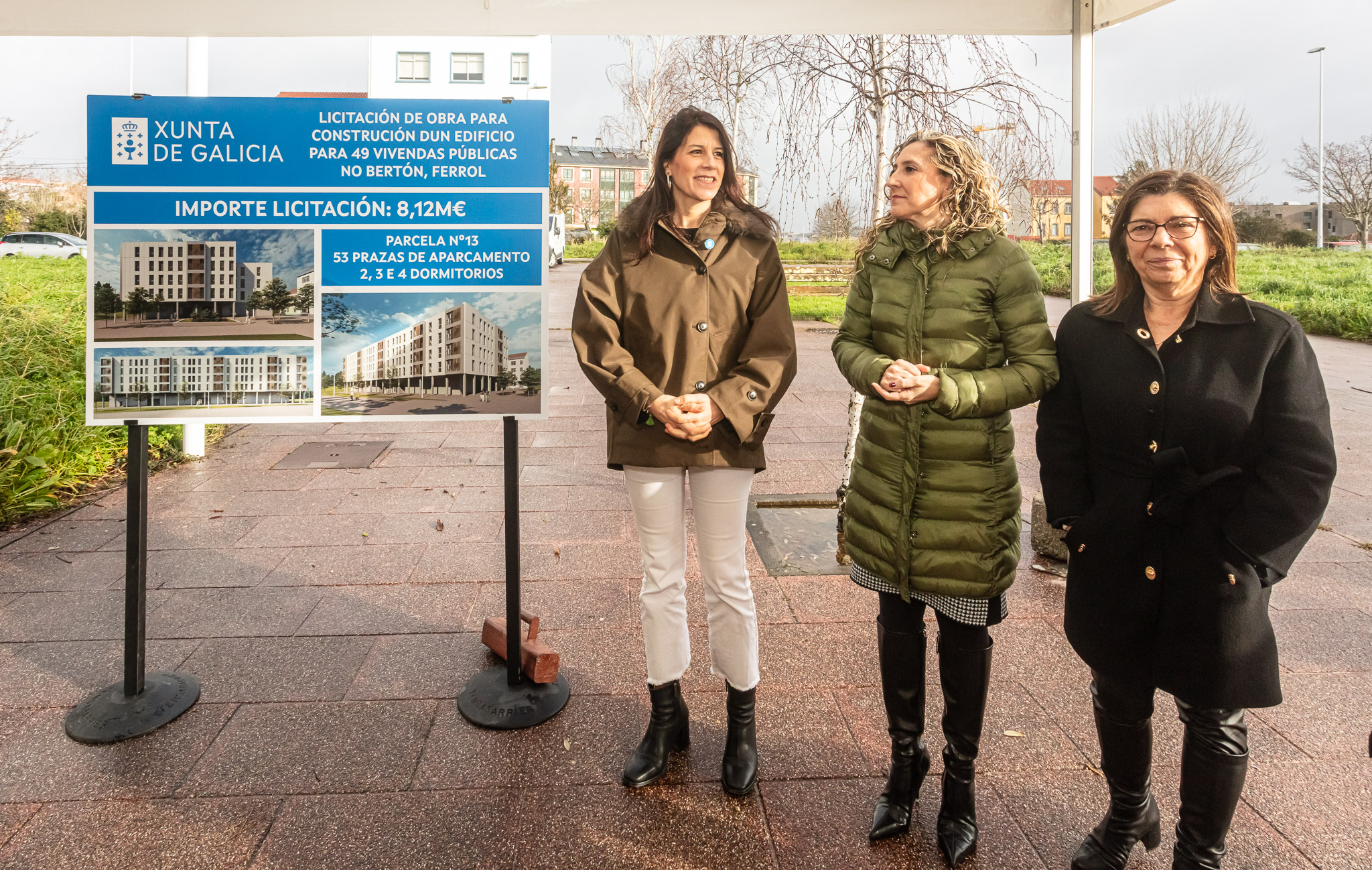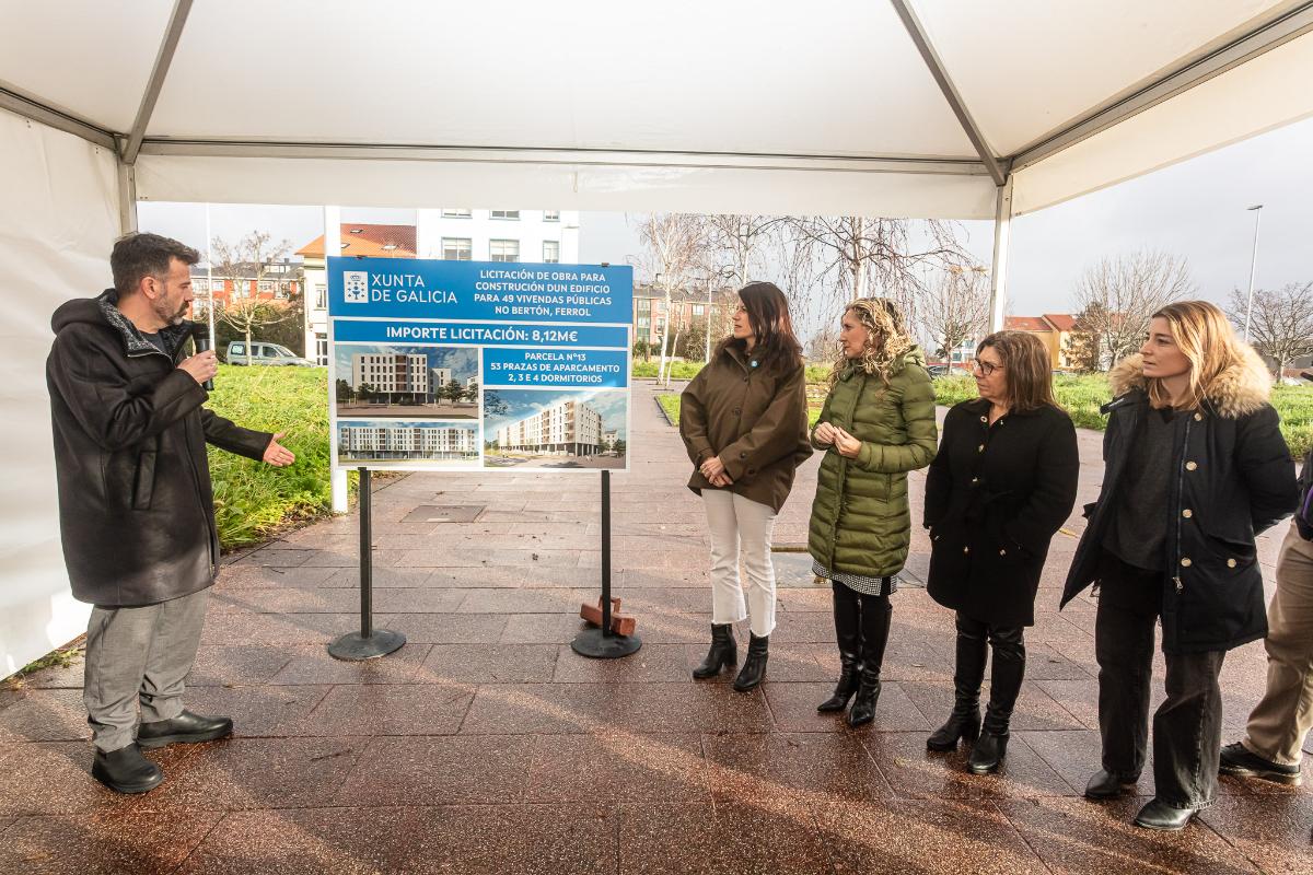 A Xunta licita as obras dun novo edificio de 49 vivendas públicas no Bertón, en Ferrol, que suporán un investimento de 8,1M€. Así o destacou hoxe a conselleira de Vivenda e Planificación de Infraestruturas, María Martínez Allegue, que xunto coa delegada territorial da Xunta en Ferrol, Martina Aneiros, se achegou á cidade departamental.