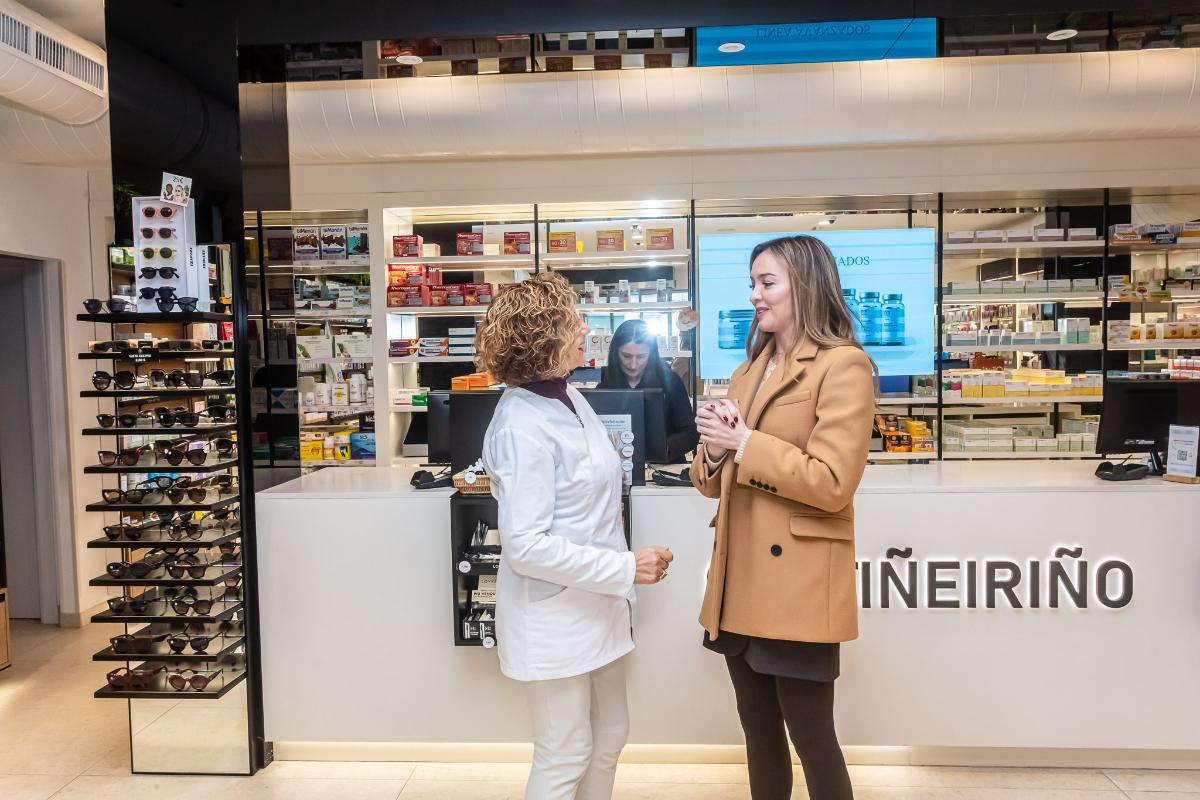 Fabiola García nunha visita á Farmacia Castiñeiriño lembrou que as familias xa poden solicitar a Tarxeta Benvida da convocatoria do 2026