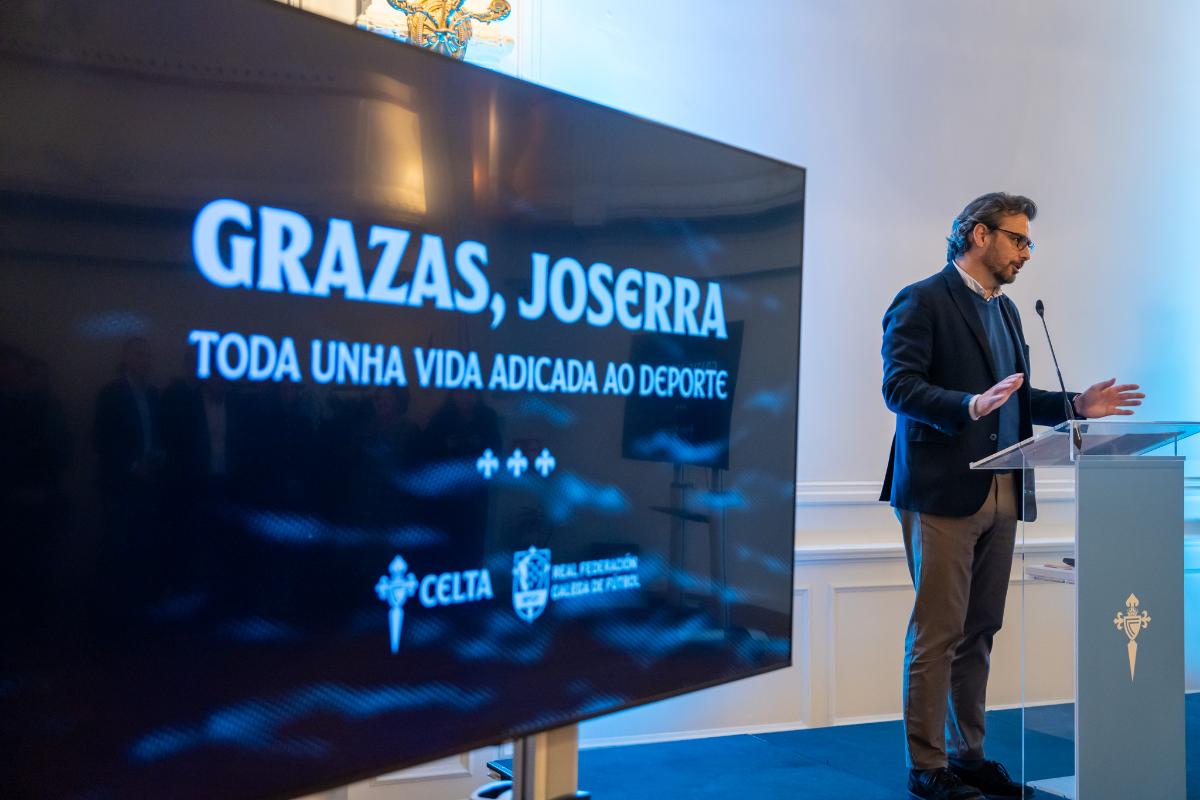 O conselleiro de Presidencia, Xustiza e Deportes, Diego Calvo, acompañado do secretario xeral para o Deporte, Roberto García, e a delegada territorial da Xunta en Vigo, Ana Ortiz, participou este serán na homenaxe organizada polo Real Club Celta de Vigo e a Real Federación Galega de Fútbol ao exsecretario xeral para o Deporte, José Ramón Lete Lasa. Na súa intervención, o conselleiro destacou o compromiso co deporte galego demostrado por Lete Lasa ao longo da súa ampla traxectoria, así como a súa capacidade de diálogo e de escoita cos diferentes axentes do sector.
