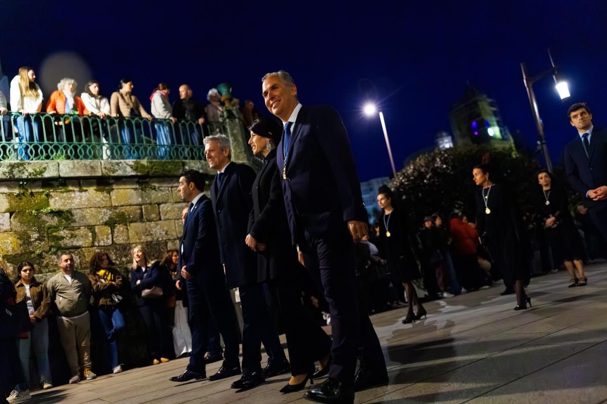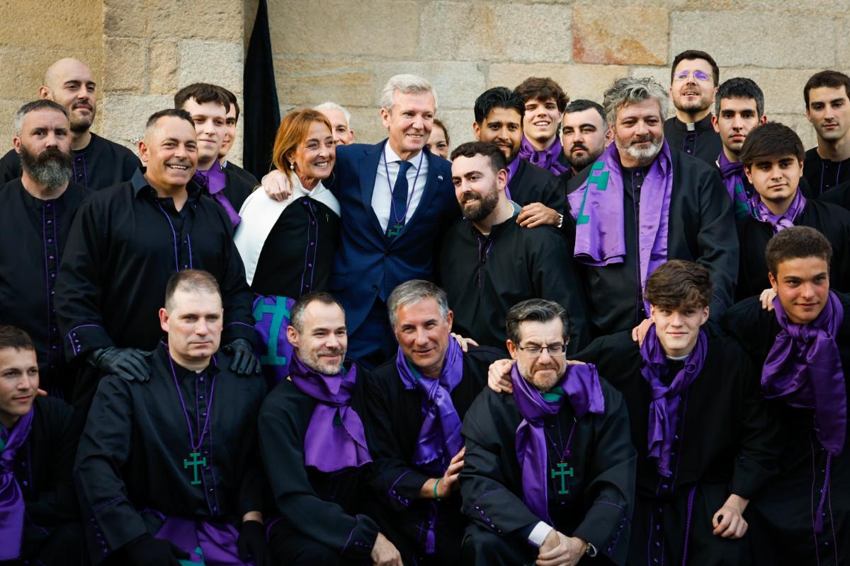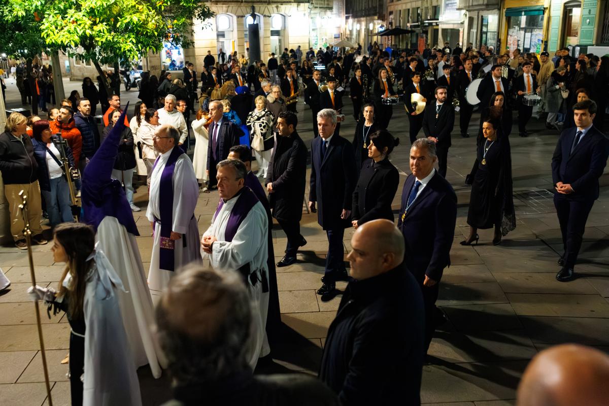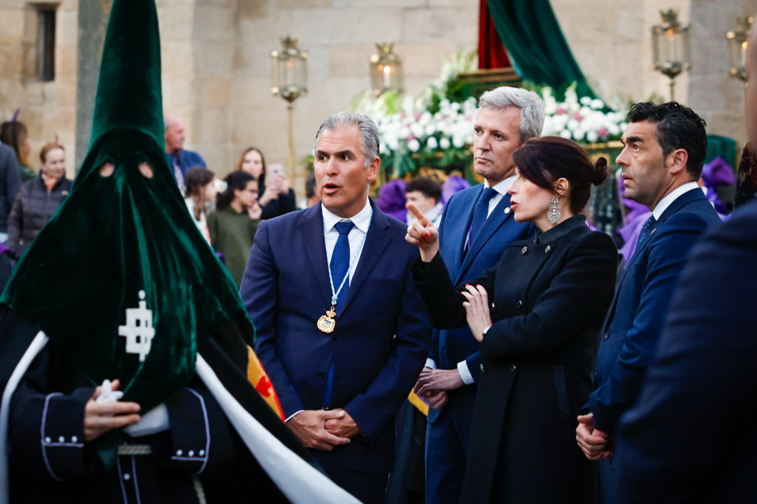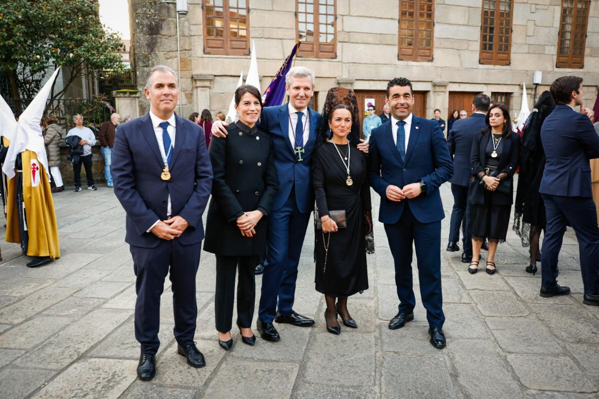 O presidente da Xunta, Alfonso Rueda, acompañado da conselleira de Vivenda e Planificación de Infraestruturas, María Martínez Allegue, participou hoxe na procesión dos Pasos do Xoves Santo que se celebrou na cidade de Pontevedra.