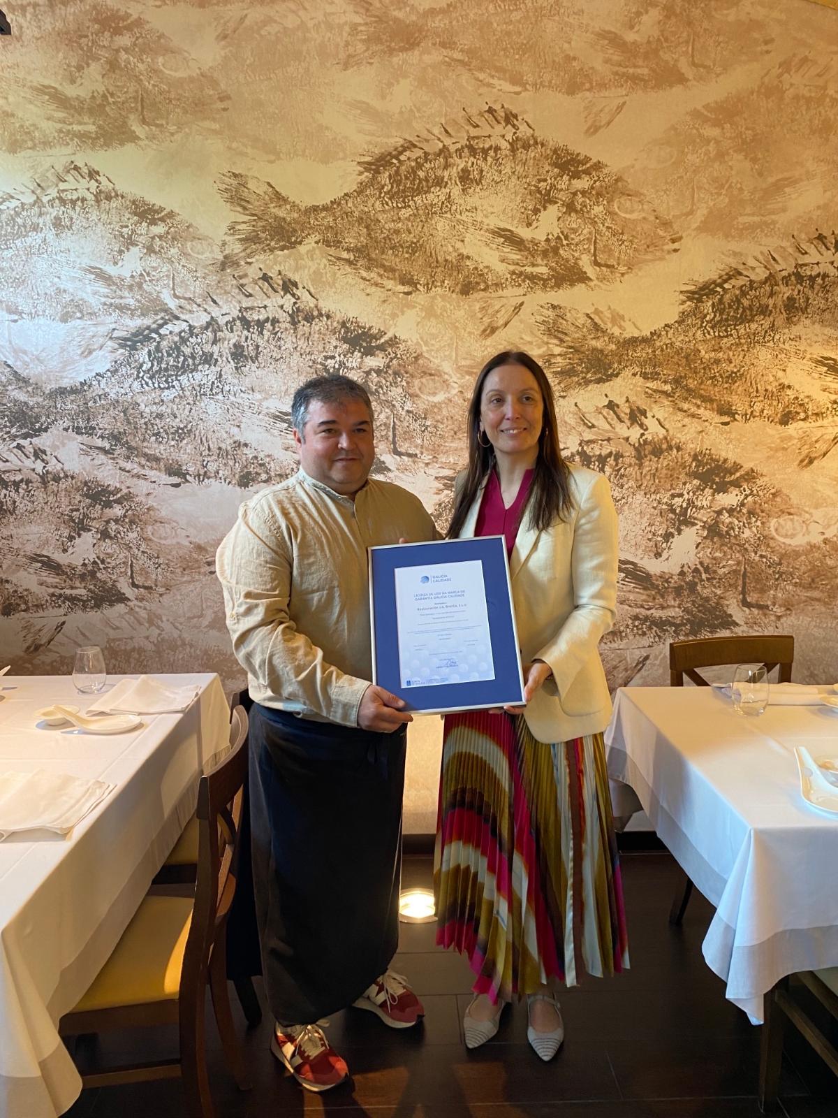 A xerente de Galicia Calidade, Ana Méndez, entregou hoxe o certificado de uso da marca de garantía Galicia Calidade, dependente da Vicepresidencia Primeira e Consellería de Economía, Industria e Innovación, aos responsables dos restaurantes composteláns O Tamboril e O Ferro, poñendo en valor o esforzo pola elaboración dunha experiencia gastronómica próxima e de calidade. A obtención do selo de garantía permitirá ás empresas incluír a nova sinalización coa que se identifica ás empresas adheridas nas súas fachadas, así como engadir o distintivo nas diferentes accións para a súa promoción comercial.