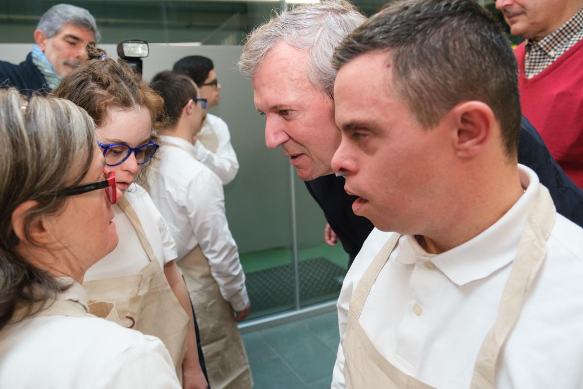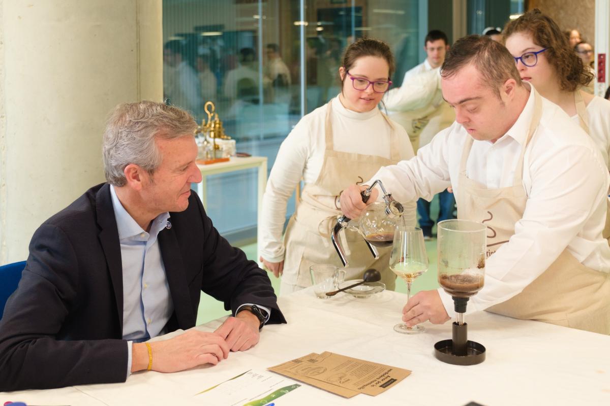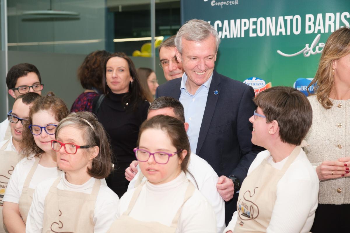 O presidente da Xunta, Alfonso Rueda, acompañado da conselleira de Política Social e Xuventude, Fabiola García, achegouse esta mañá ao X Campionato Barista Down 2024 que se celebra en Santiago de Compostela.