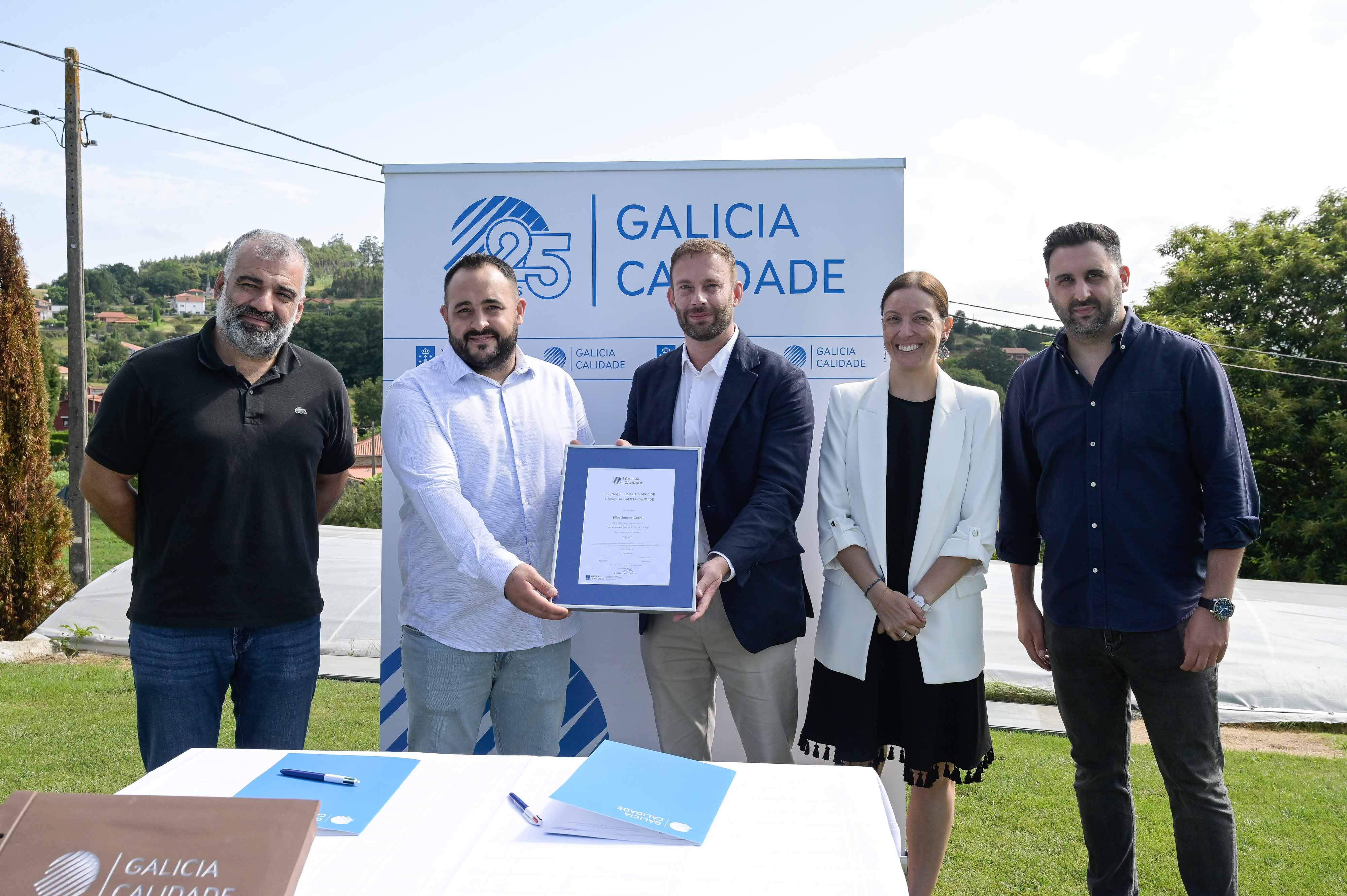 O delegado territorial da Xunta na Coruña, Gonzalo Trenor, e a xerente de Galicia Calidade, Ana Méndez, entregaron aos responsables da compañía de Oza-Cesuras a certificación e a nova sinalización que identifica ás empresas adheridas ao selo de garantía da Consellería de Economía, Industria e Innovación