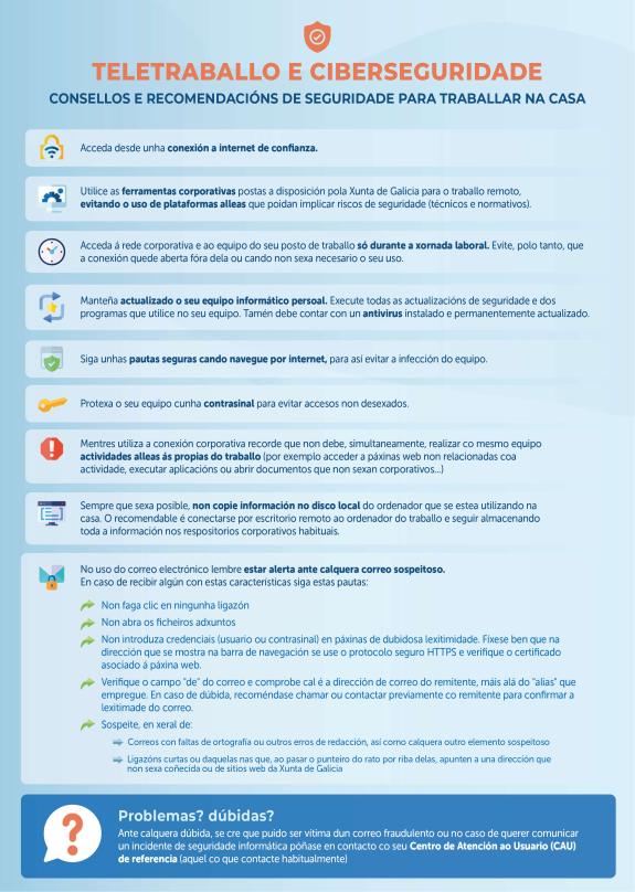 No desempeño do teletraballo é importante seguir unha serie de recomendacións de ciberseguridade co fin de protexer a información e os servizos dos riscos que se poden xerar.