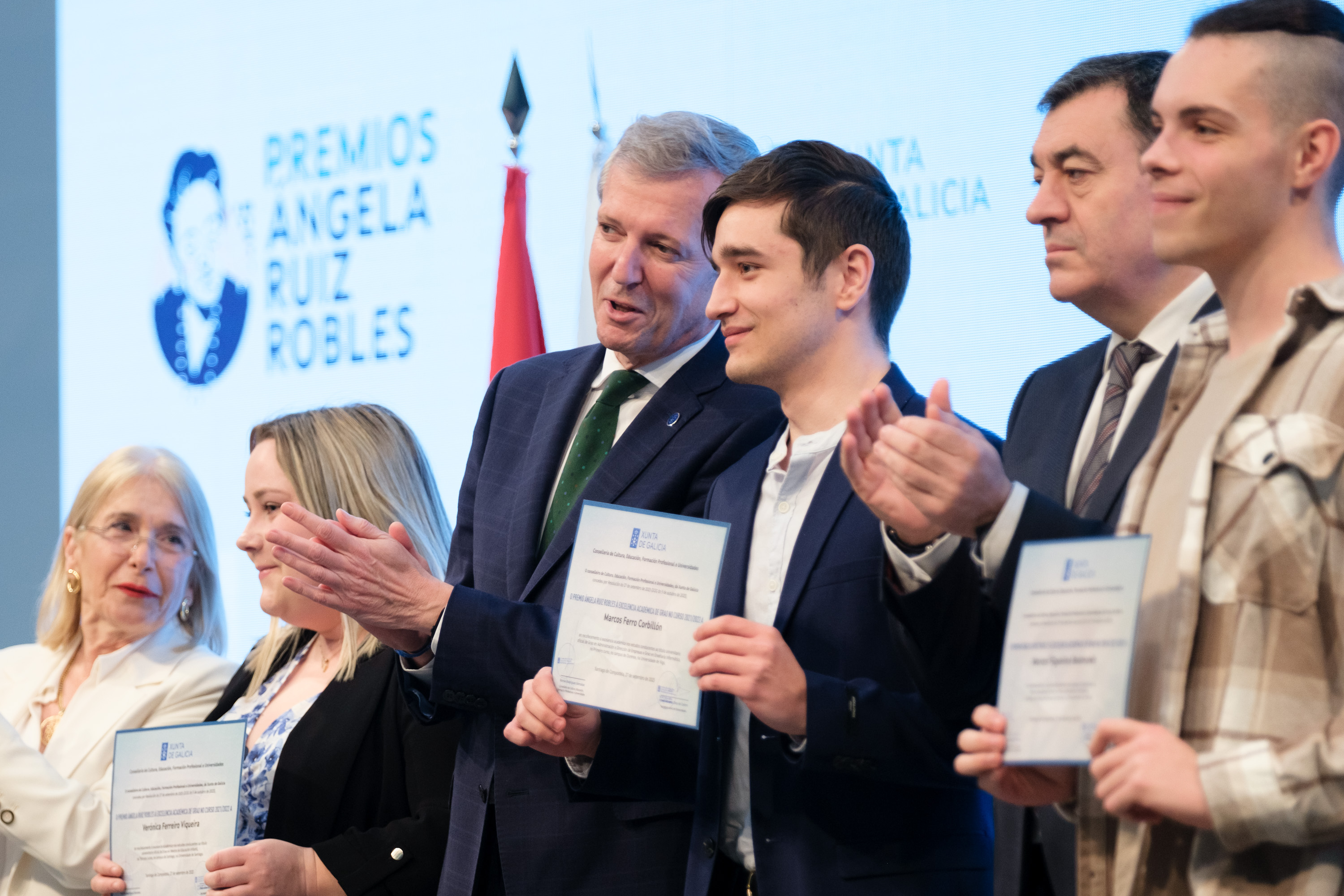 Rueda puso en valor estas decisiones del Gobierno gallego durante el acto de entrega de los Premios Excelencia Académica, que este año llevan por primera vez el nombre de la maestra e inventora Ángela Ruíz Robles. Estos galardones están impulsados por la Xunta para reconocer a los mejores expedientes de la universidad gallega, situándose este año todos por encima del 8 de promedio.