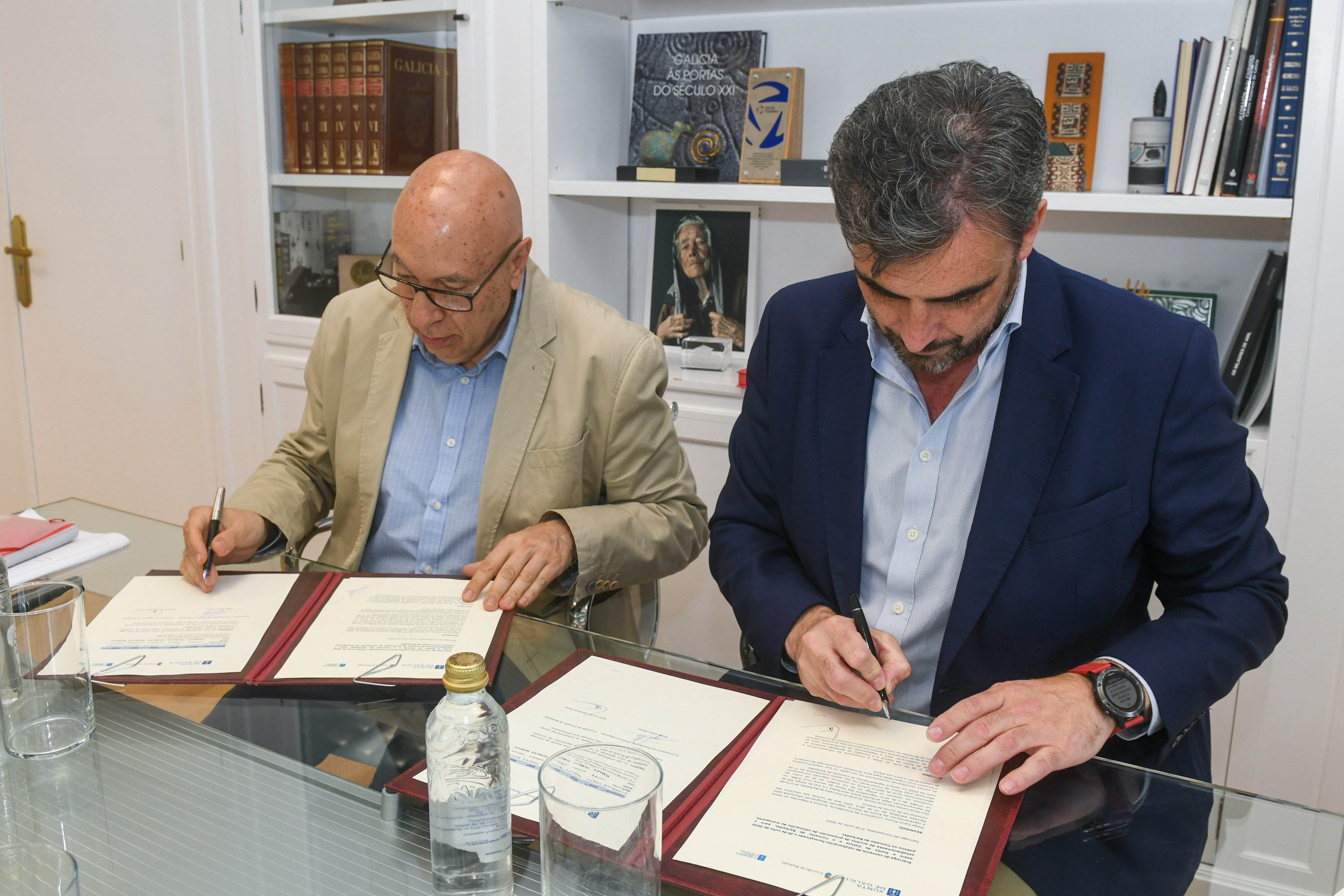 O conselleiro de Presidencia, Xustiza e Deportes, Diego Calvo, e o alcalde Xosé Carlos Valcárcel Doval asinaron hoxe o acordo para establecer accións de promoción no uso do transporte público, que suporá unha achega de case 491.200 euros ata 2028