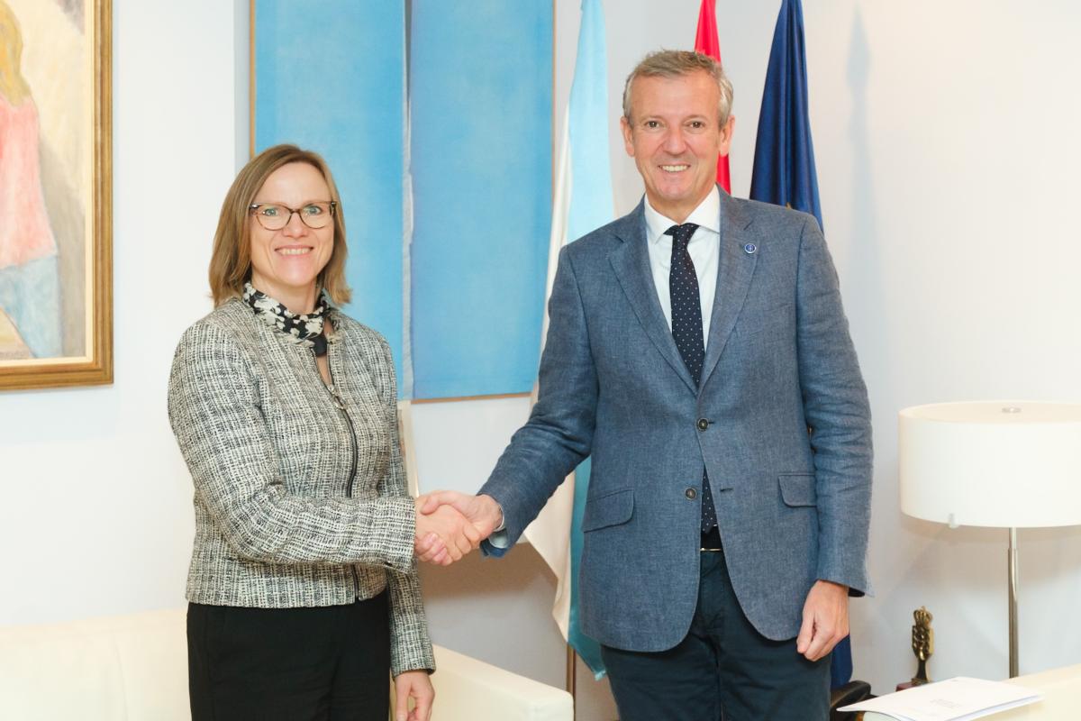O presidente da Xunta, Alfonso Rueda, acompañado do conselleiro de Presidencia, Xustiza e Deportes, Diego Calvo, reuniuse esta mañá coa embaixadora de Finlandia en España, Sari Rautio.