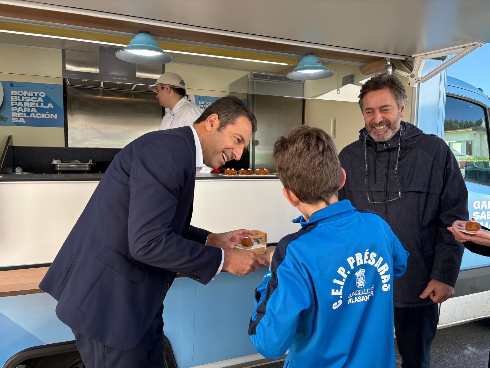 A Consellería do Mar achega aos escolares do CEIP de Présaras os beneficios de consumir produtos pesqueiros coa campaña Galicia Sabe AMAR. O responsable deste departamento, Alfonso Villares, visitou a foodtruck que este mércores recalou no centro educativo, situado no concello coruñés de Vilasantar, co fin de dar continuidade ao obxectivo do Goberno autonómico de pór en valor a excelente calidade dos produtos que saen da costa galega e, en consecuencia, dos importantes efectos que ten a súa inxesta para a salubridade, así como para a economía que se xera en torno á cadea mar-industria.