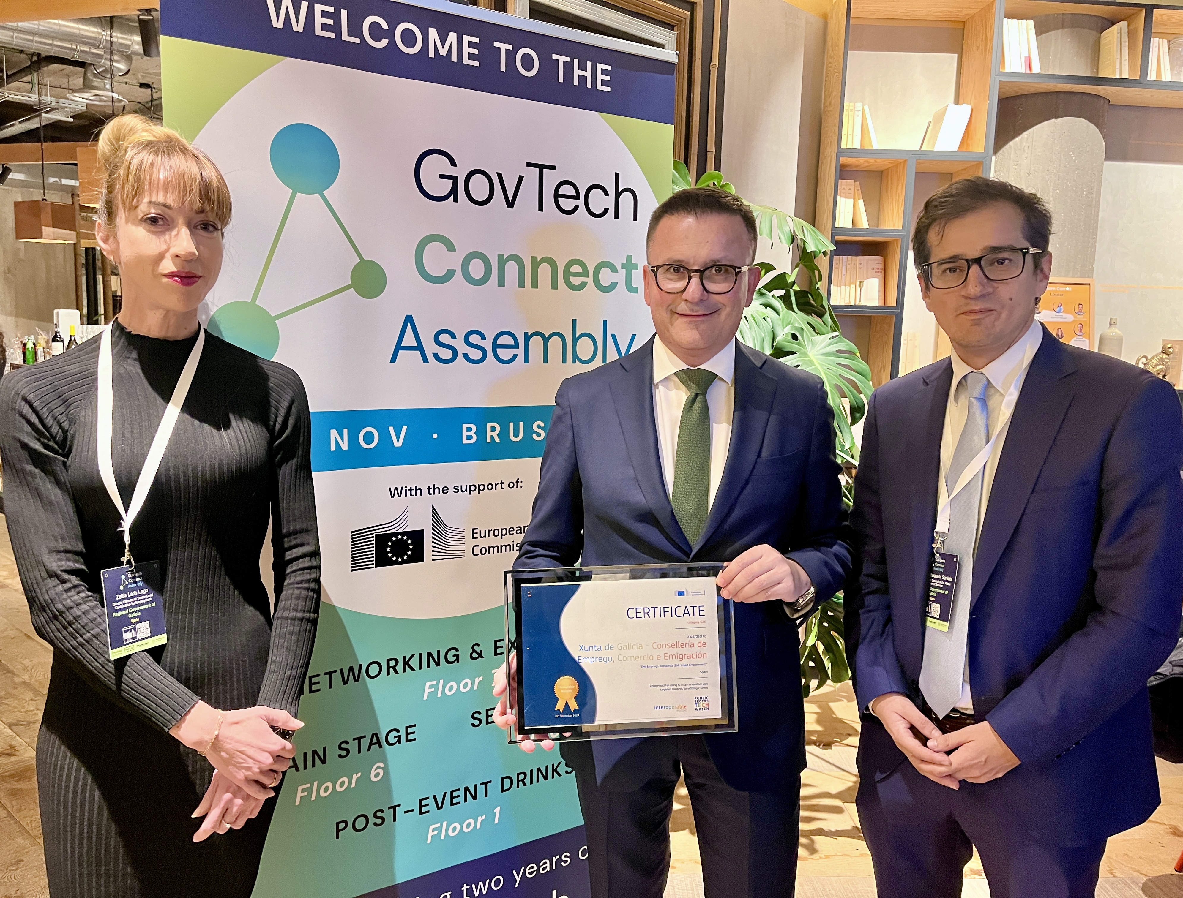 O conselleiro de Emprego, Comercio e Emigración, José González, acompañado pola directora xeral de Formación e Cualificación para o Emprego, Zeltia Lado, recolleu hoxe en Bruxelas o premio que outorga o Observatorio de Vixilancia Tecnolóxica do Sector Público da Comisión Europea á Xunta de Galicia polo desenvolvemento da ferramenta EMi, que está dispoñible nas 54 oficinas de emprego de Galicia. Trátase dun feito, destacou o conselleiro, que avala o camiño que segue Galicia con medidas pioneiras a nivel autonómico en España para potenciar a empregabilidade da cidadanía e o mercado laboral galego e que responden ao que recomenda a Unión Europea.