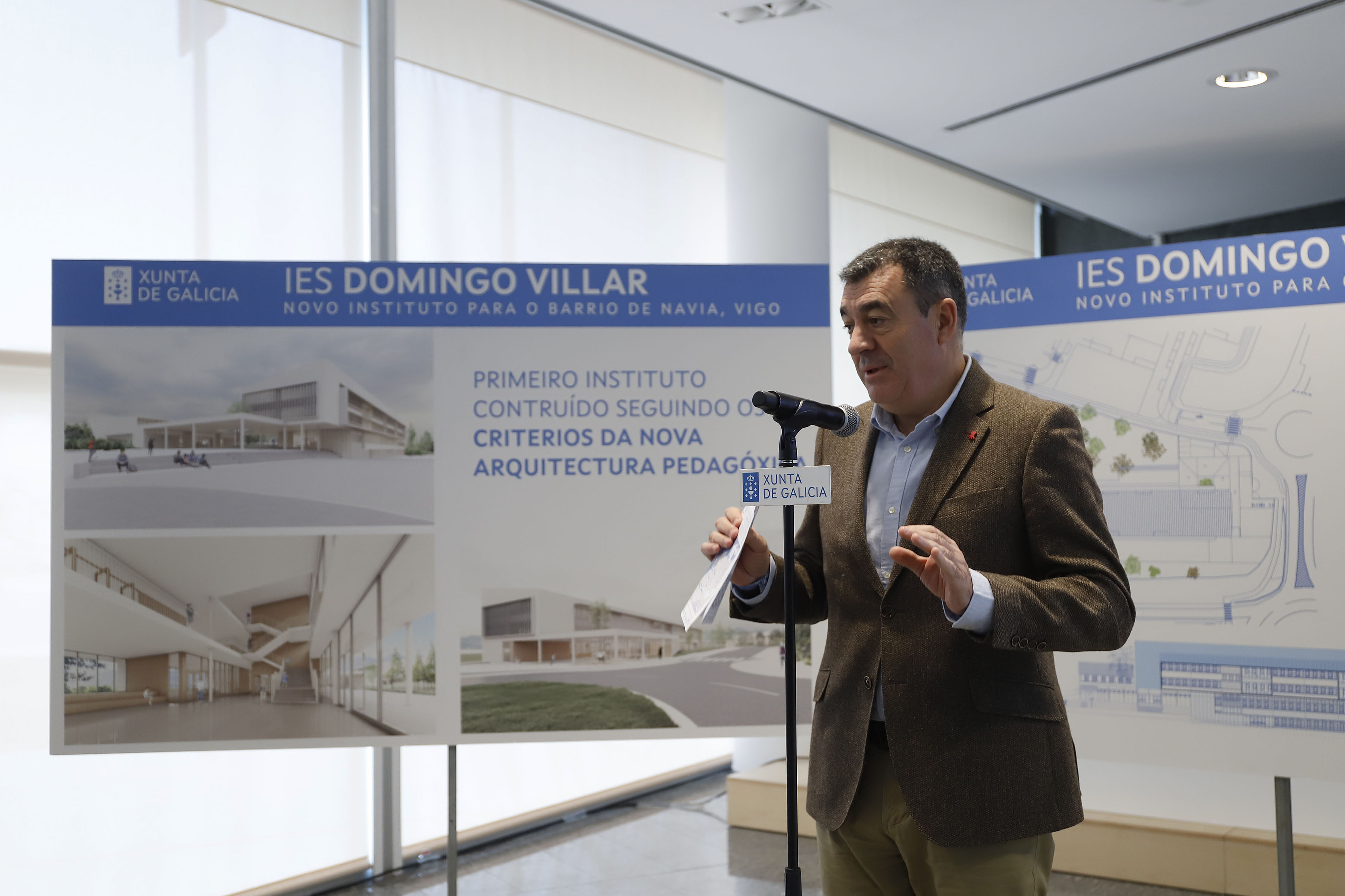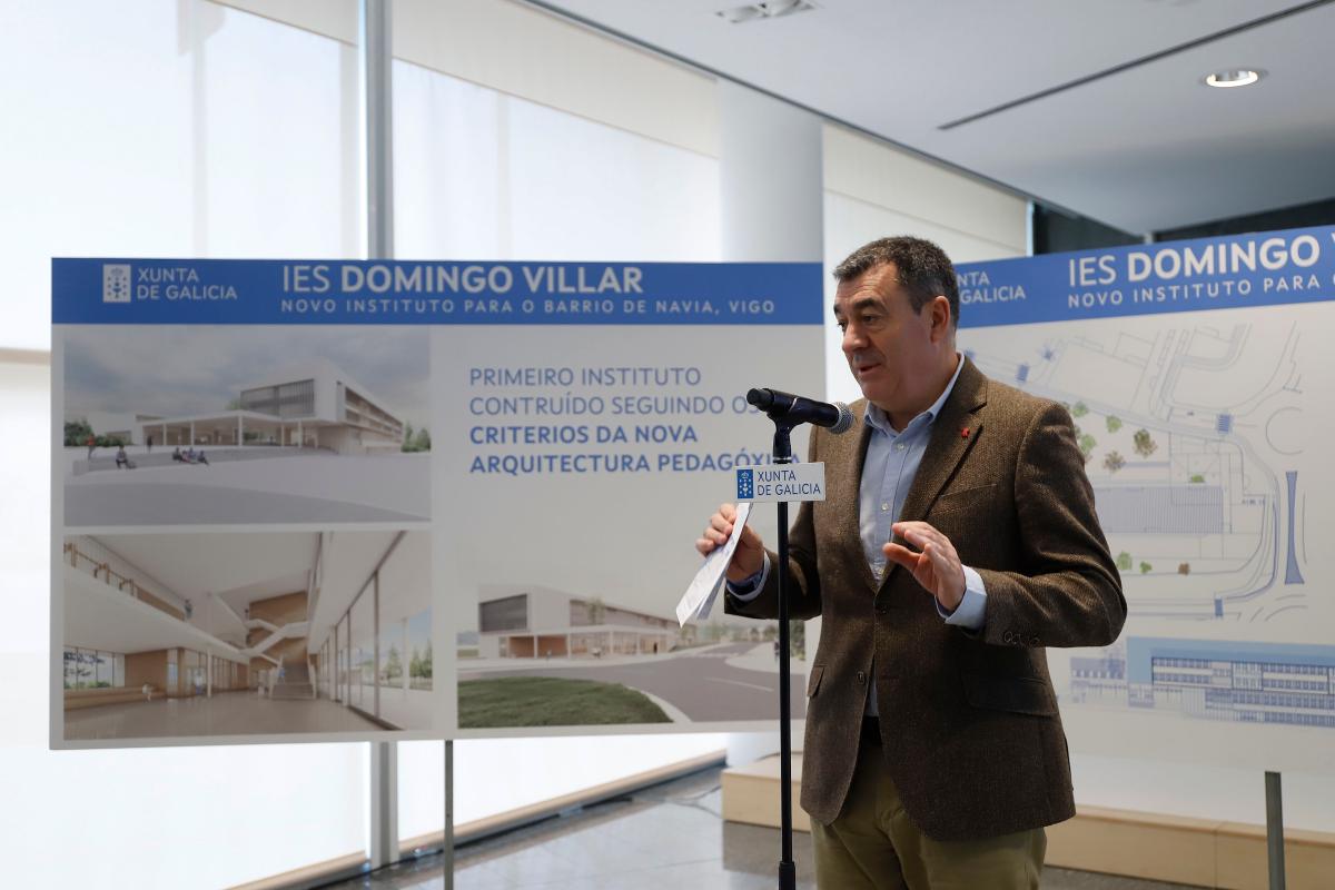 El conselleiro de Educación, Ciencia, Universidades y FP, Román Rodríguez, acompañado por la delegada de la Xunta en Vigo, Ana Ortiz, presentó hoy el proyecto del nuevo Instituto IES Domingo Villar, que el Gobierno gallego comenzará a construir en el barrio vigués de Navia en 2025. El instituto, el primero de Galicia diseñado siguiendo los parámetros académicos, tecnológicos y de sostenibilidad recogidos en el Plan de nueva arquitectura pedagógica, cuenta con una inversión de 19 M€ y un plazo de ejecución de 24 meses desde que se contrate la obra y se cuente con la licencia municipal.