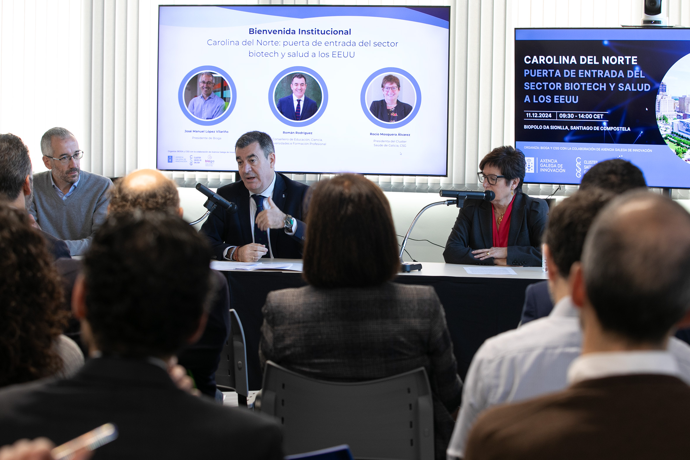 El conselleiro de Educación, Ciencia, Universidades y Formación Profesional, Román Rodríguez, inauguró hoy en el Biopolo de Sionlla, en Santiago de Compostela, la jornada Carolina del Norte: puerta de entrada del sector biotech y salud a los Estados Unidos, organizada por Bioga y el Clúster de Salud de Galicia, con el apoyo de la Xunta de Galicia. En este evento se hizo balance de la Estrategia de consolidación del sector biotecnológico de Galicia 21-25 y se presentaron las oportunidades de cooperación entre Galicia y Carolina del Norte en este sector.