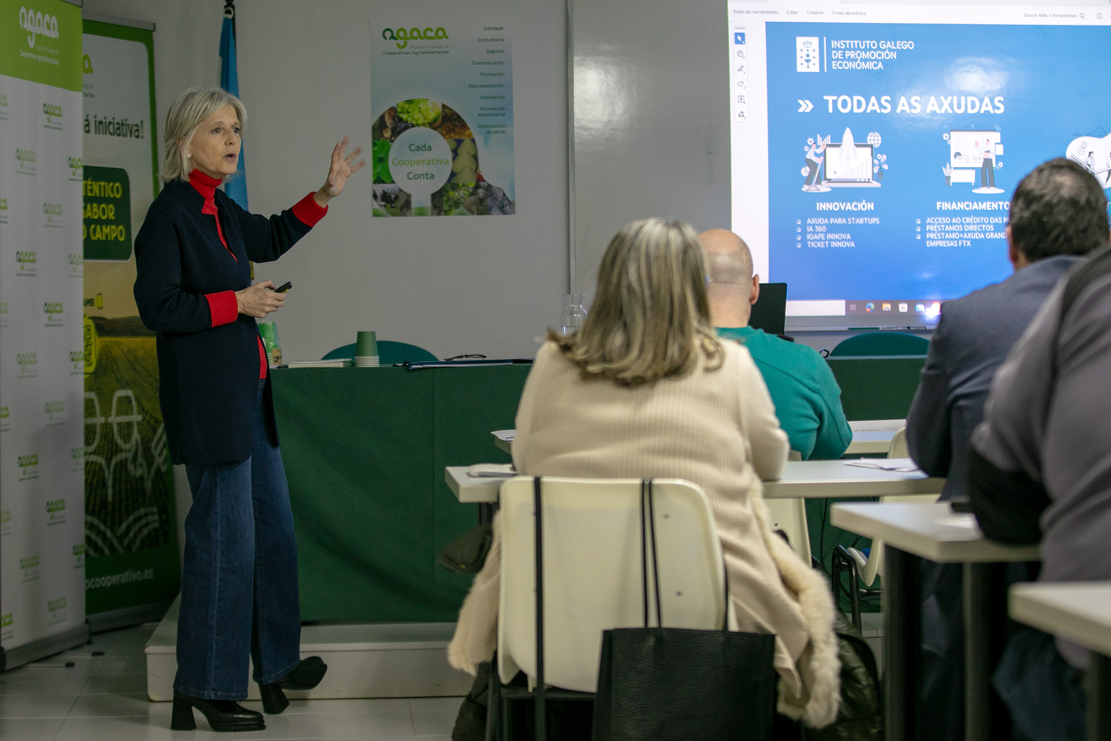 A directora do Igape, Covadonga Toca e a directora xeral de Traballo Autónomo e Economía Social, Marta Mariño, participaron hoxe na xornada de Apoio ao Emprendemento Cooperativo, organizada pola Asociación Galega de Cooperativas Agroalimentarias (AGACA), onde expuxo as principais liñas de axuda que a Xunta de Galicia pon á disposición de cooperativas, startups, pemes e autónomos ao longo de 2025.