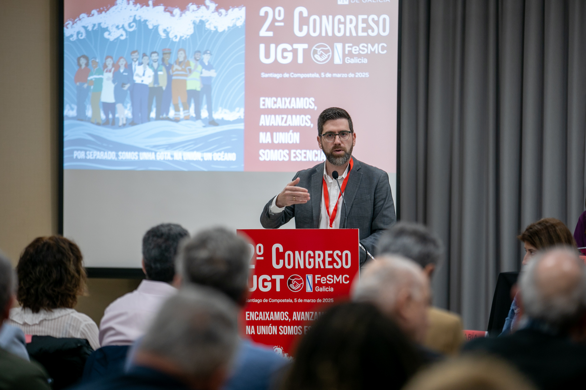 El secretario general de Empleo y Relaciones Laborales, Pablo Fernández, junto con la directora general de Movilidad, Judit Fontela, asistió hoy al II Congreso Común de la Federación de Servicios, Movilidad y Consumo de UGT Galicia (FeSMC).