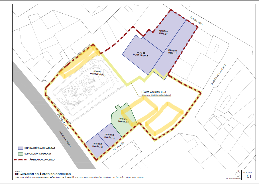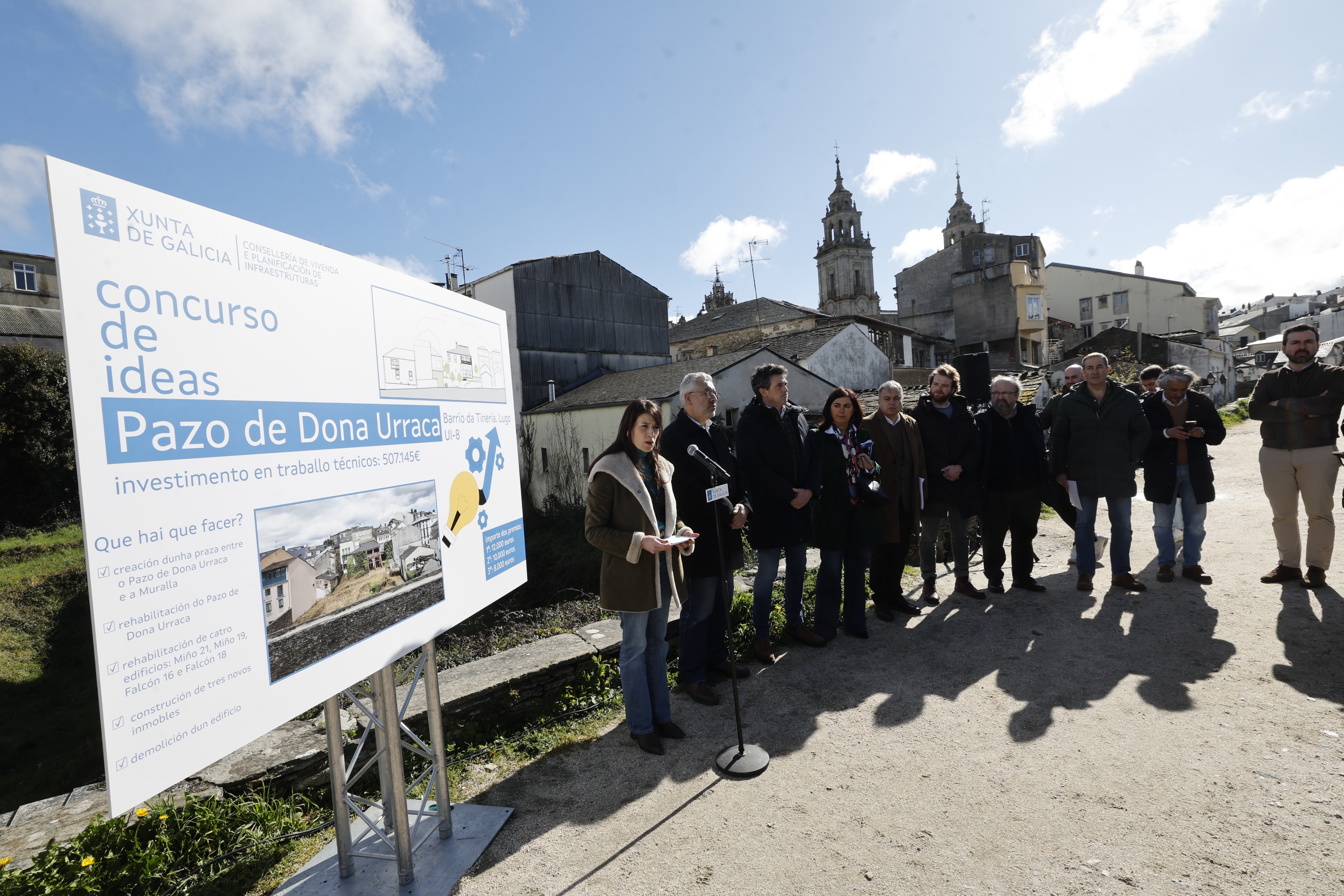 La conselleira de Vivenda e Planificación de Infraestructuras, María M. Allegue, junto con el delegado territorial de la Xunta en Lugo, Javier Arias, y el secretario xeral de Vivenda e Urbanismo, Heriberto García Porto, visitó hoy el entorno del Pazo de Doña Urraca en Lugo. M. Allegue anunció que el plazo para el concurso de ideas para la redacción del plan especial de la UI-8, la recuperación y puesta en valor del pazo del siglo XII, y la rehabilitación y construcción de inmuebles en el entorno, abrirá mañana. Los interesados tendrán 2 meses para presentar sus ofertas. El presupuesto estimado de las obras de la futura intervención en este ámbito superará los 6,2M€.