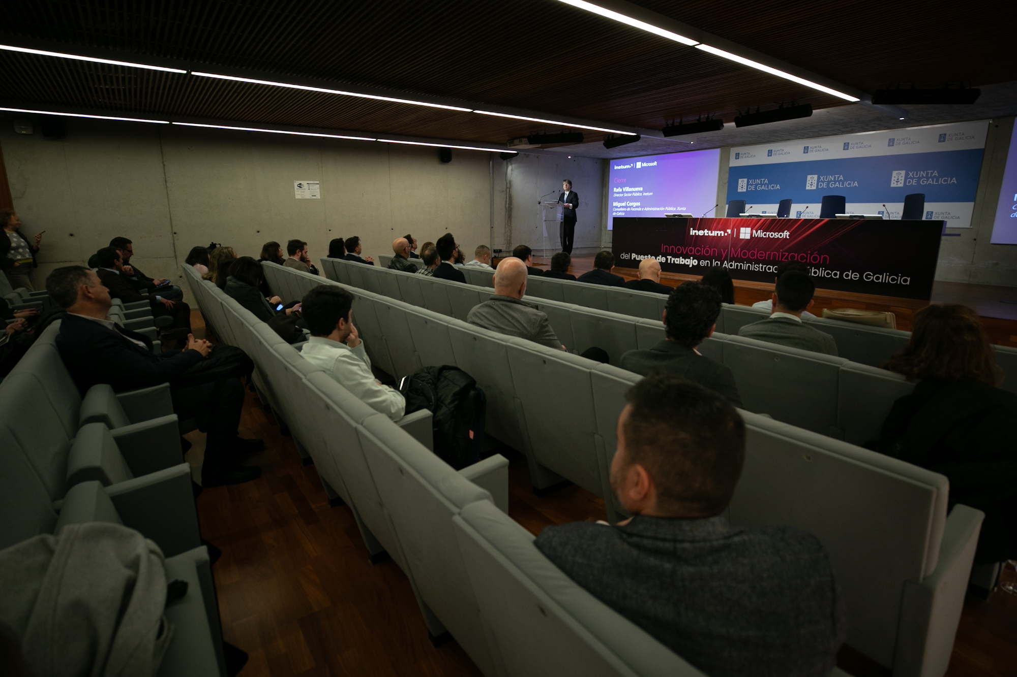 Miguel Corgos, clausurou hoxe a xornada Modernización do Posto de Traballo Público nas Administracións públicas de Galicia. Alí salientou que ante os retos aos que se enfronta a Comunidade nos vindeiros anos, como o envellecemento da poboación ou a dispersión xeográfica, é perentoria unha xestión aínda máis eficaz. Para iso, “temos que afrontar a modernización do posto de traballo en clave de produtividade e servizo público”.