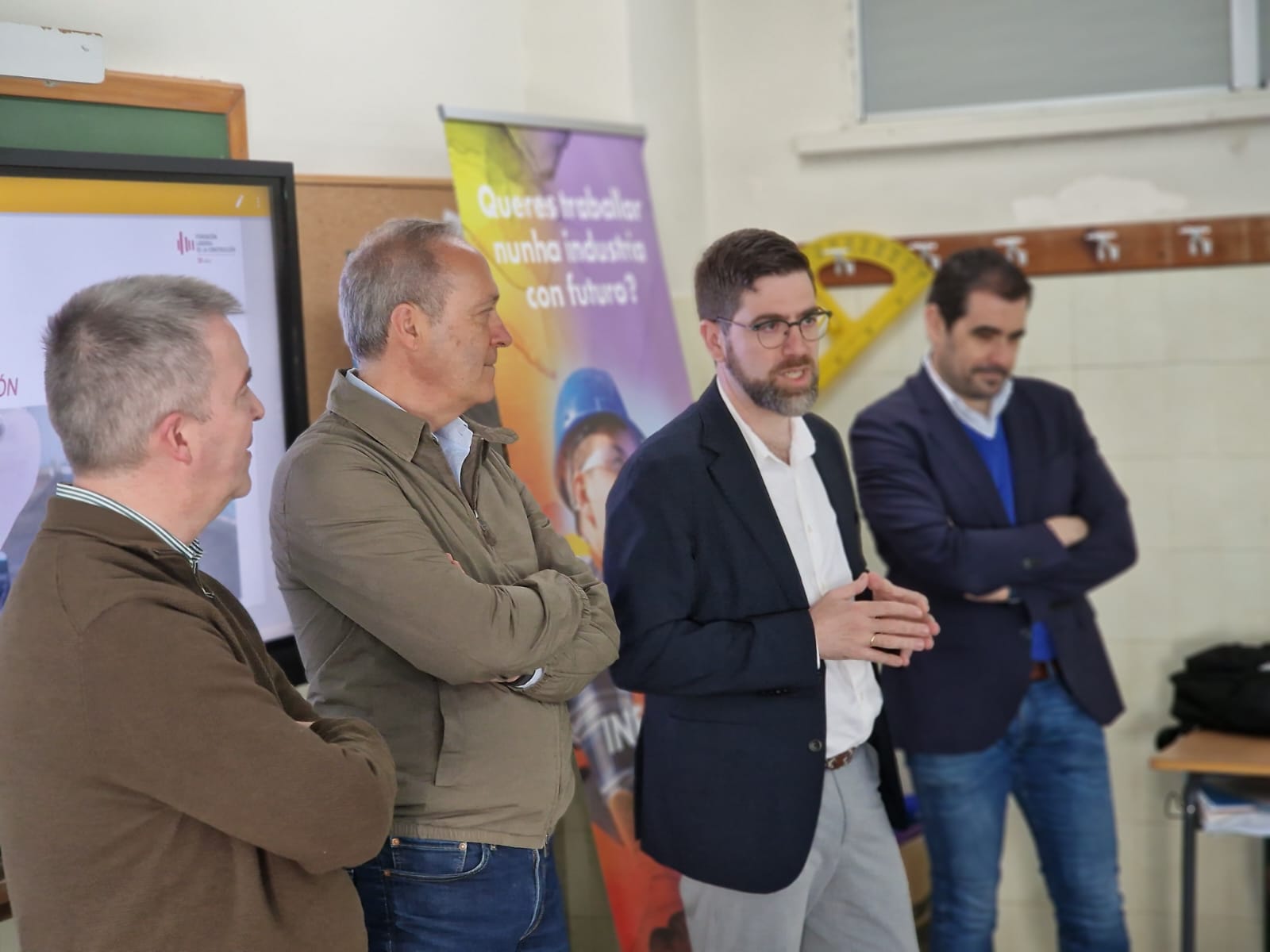 O secretario xeral de Emprego e Relacións Laborais, Pablo Fernández, achegouse esta mañá ata o colexio CPR Plurilingüe San Narciso de Marín, onde os alumnos de 3º e 4º da Educación Secundaria Obrigatoria (ESO) participaron nunha xornada enmarcada na iniciativa promovida pola Xunta Que non te líen, ti elixes. Nesta actividade —que contou coa presenza do delegado territorial da Xunta en Pontevedra, Agustín Reguera— os participantes recibiron a visita de representantes da Fundación Laboral da Construción e persoas traballadoras do sector, quen lle deron a coñecer os diferentes oficios dentro da construción, libres de estereotipos e condicionantes de xénero.