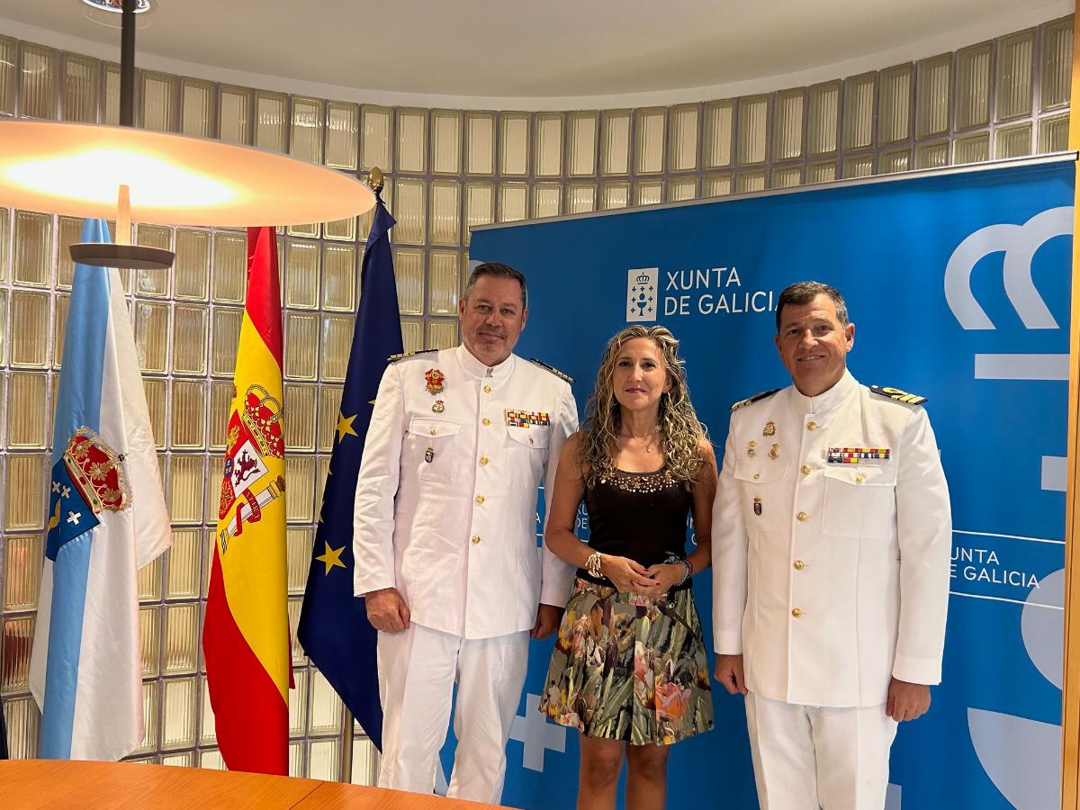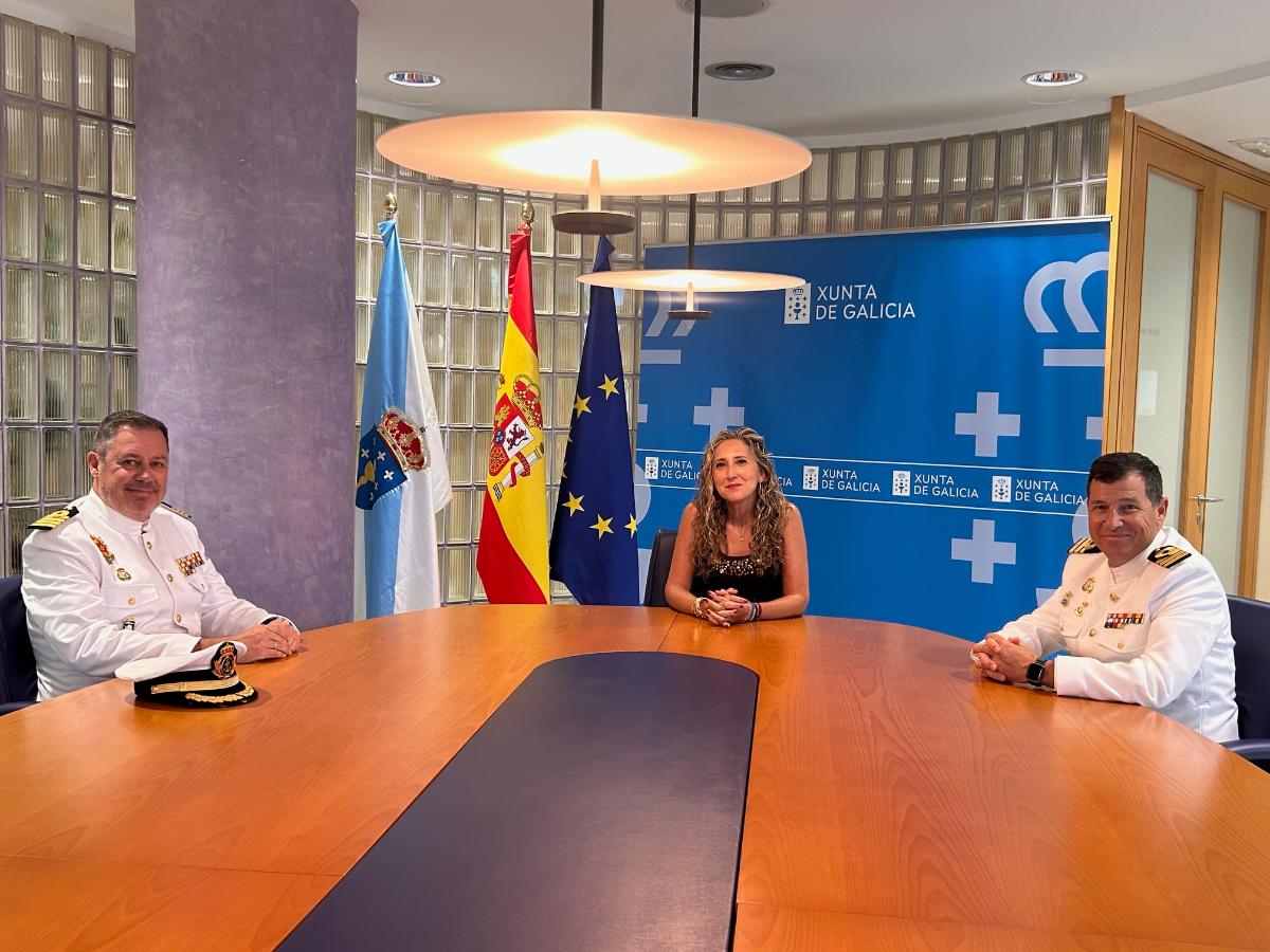 A delegada territorial da Xunta en Ferrol, Martina Aneiros, recibiu esta mañá no seu despacho aos Comandantes-Directores entrante e saínte da Escola de Especialidades “Antonio de Escaño” de Ferrol, Tomás Cordón Scharfhausen e Jaime Boloix Tortosa, respectivamente.