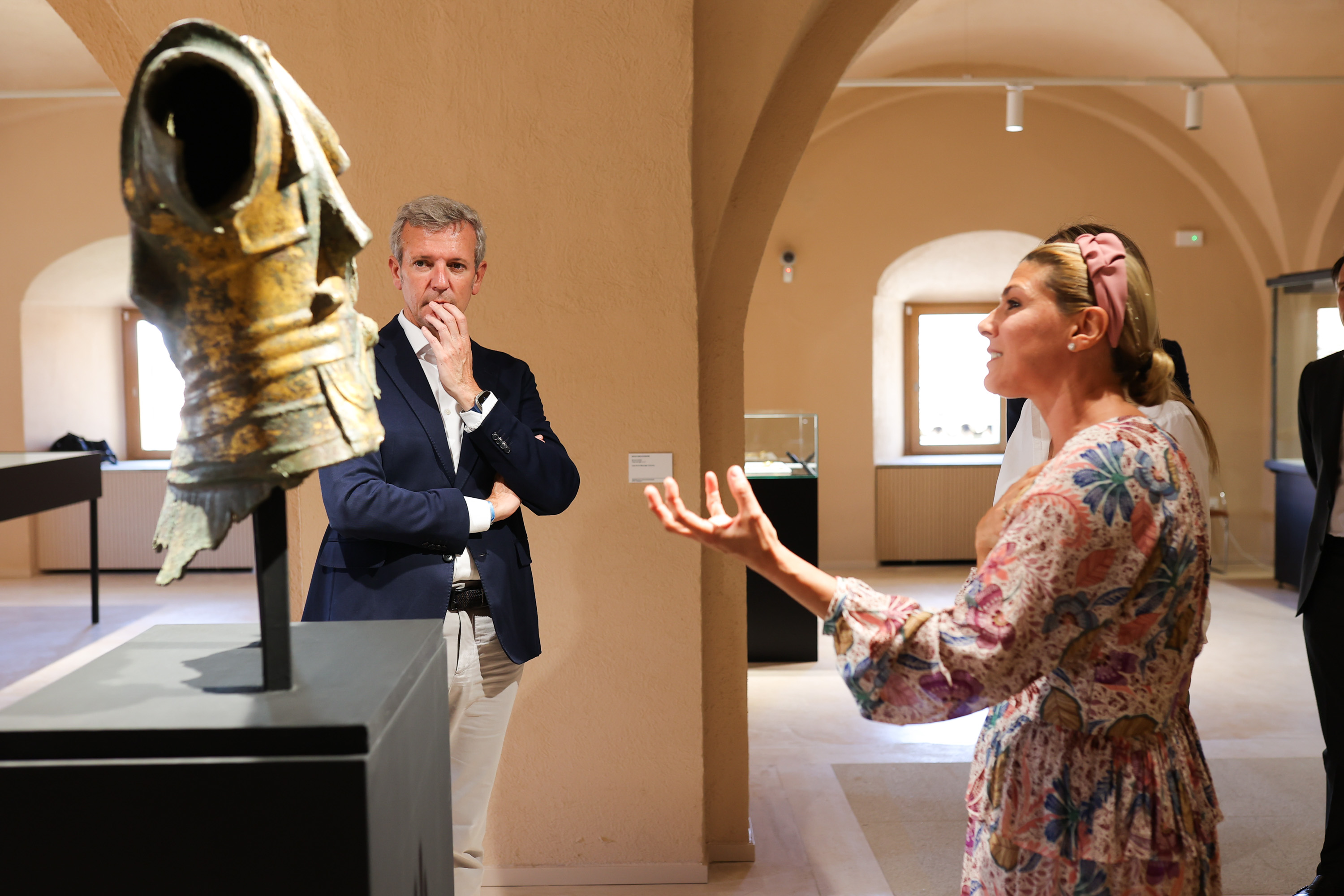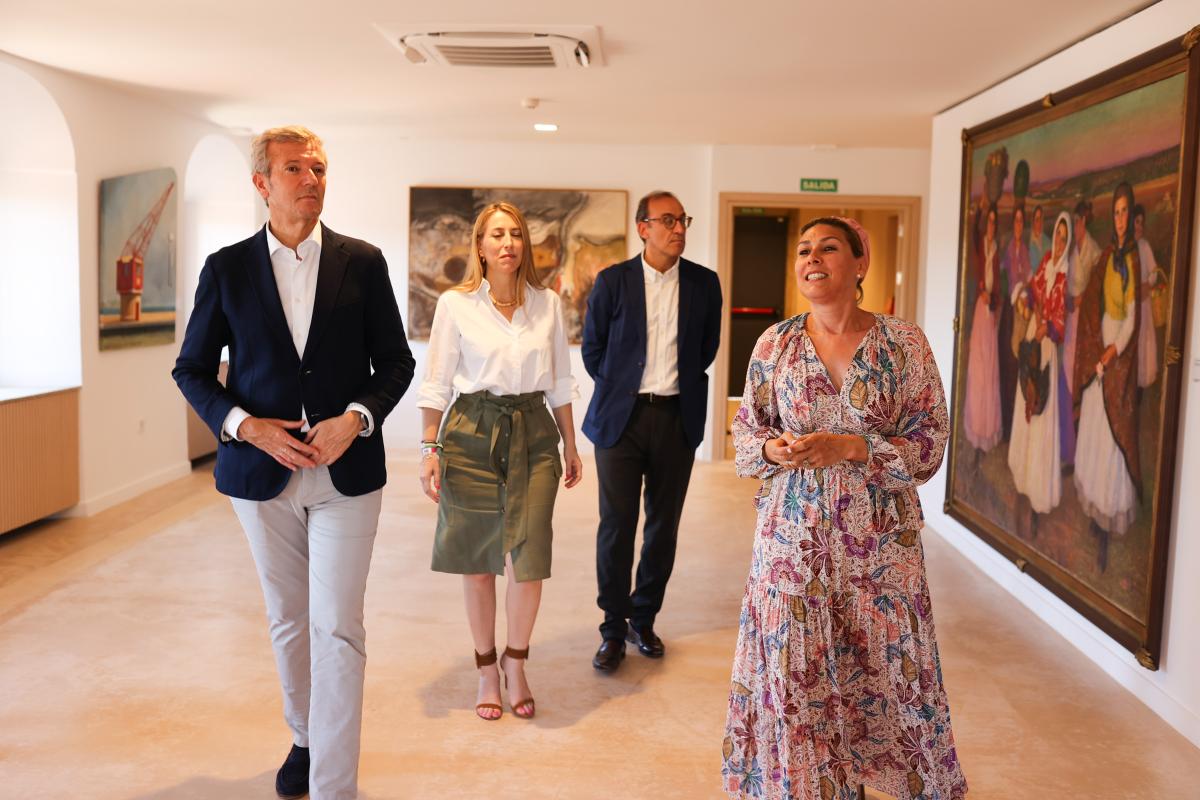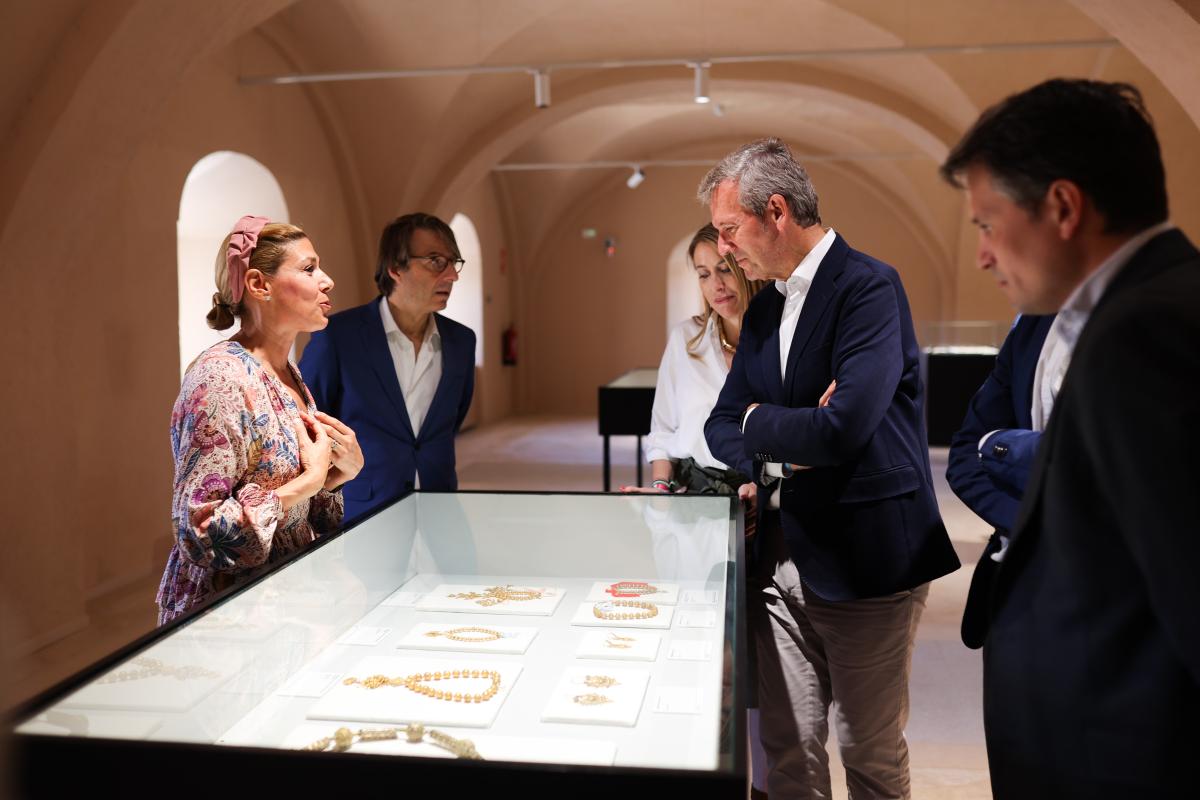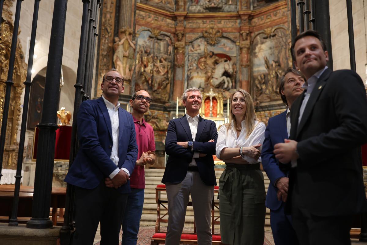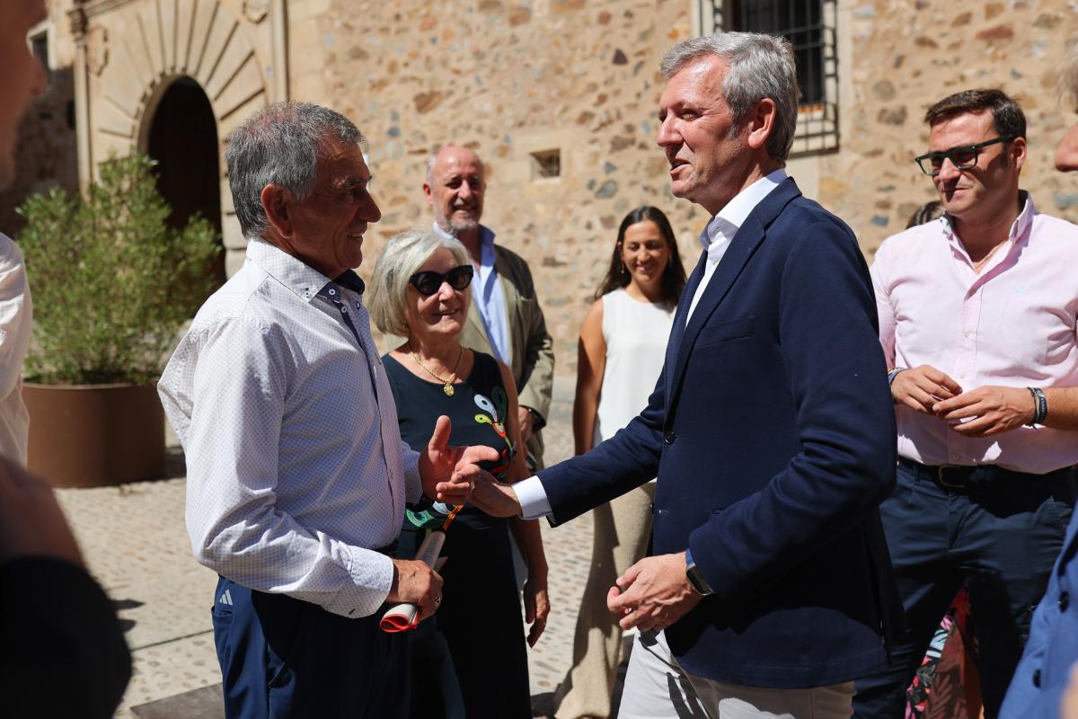 O presidente da Xunta, Alfonso Rueda, xunto coa presidenta da Junta de Extremadura, María Guardiola, descubriu esta mañá unha mouteira do Camiño de Santiago na praza de Santiago de Cáceres. Posteriomente, visitou a Casa de los Caballos do Museo de Cáceres.