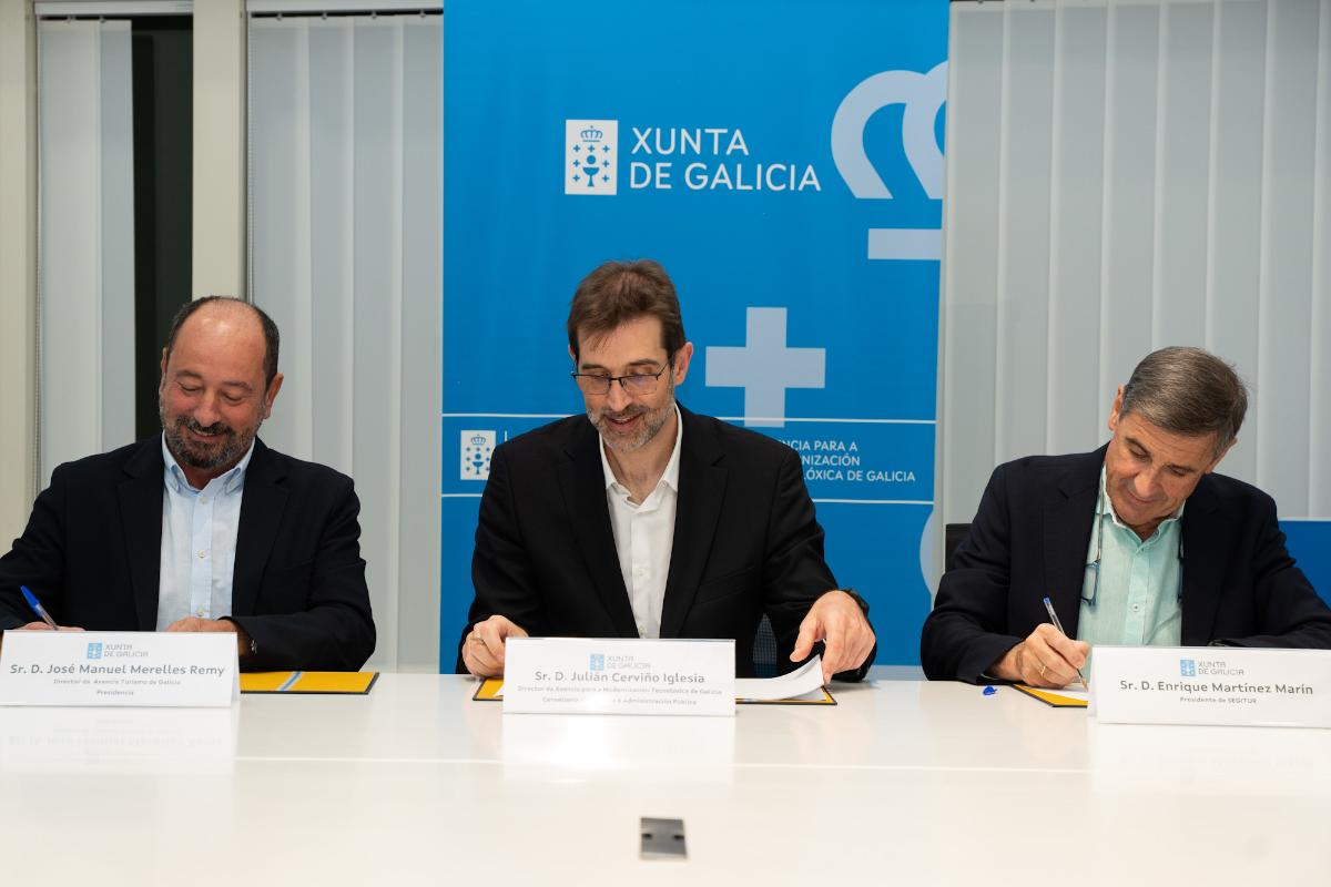 A Xunta de Galicia e a Sociedade Estatal para a Xestión das Innovacións e as Tecnoloxías Turísticas (SEGITTUR) asinaron hoxe en Santiago de Compostela un protocolo de actuación para impulsar o modelo de Destinos Turísticos Intelixentes (DTI) nesta Comunidade, que permite a incorporación de Galicia ao Sistema de Intelixencia Turística (STI). O acordo foi subscrito polo director de Turismo de Galicia, Xosé Merelles, o director da Axencia para a Modernización Tecnolóxica de Galicia, Julián Cerviño; e o presidente de SEGITTUR, Enrique Martínez, co obxectivo de impulsar a participación da comunidade galega tanto no modelo DTI como no Sistema de Intelixencia Turística (SIT).
