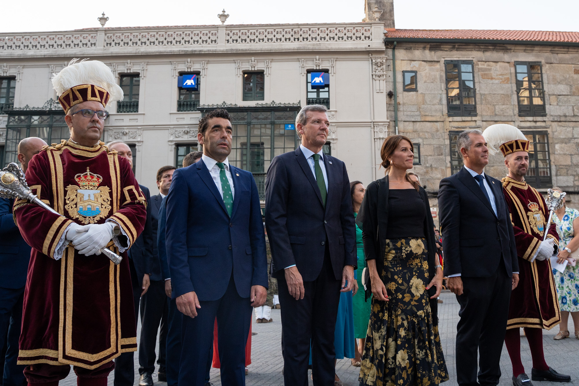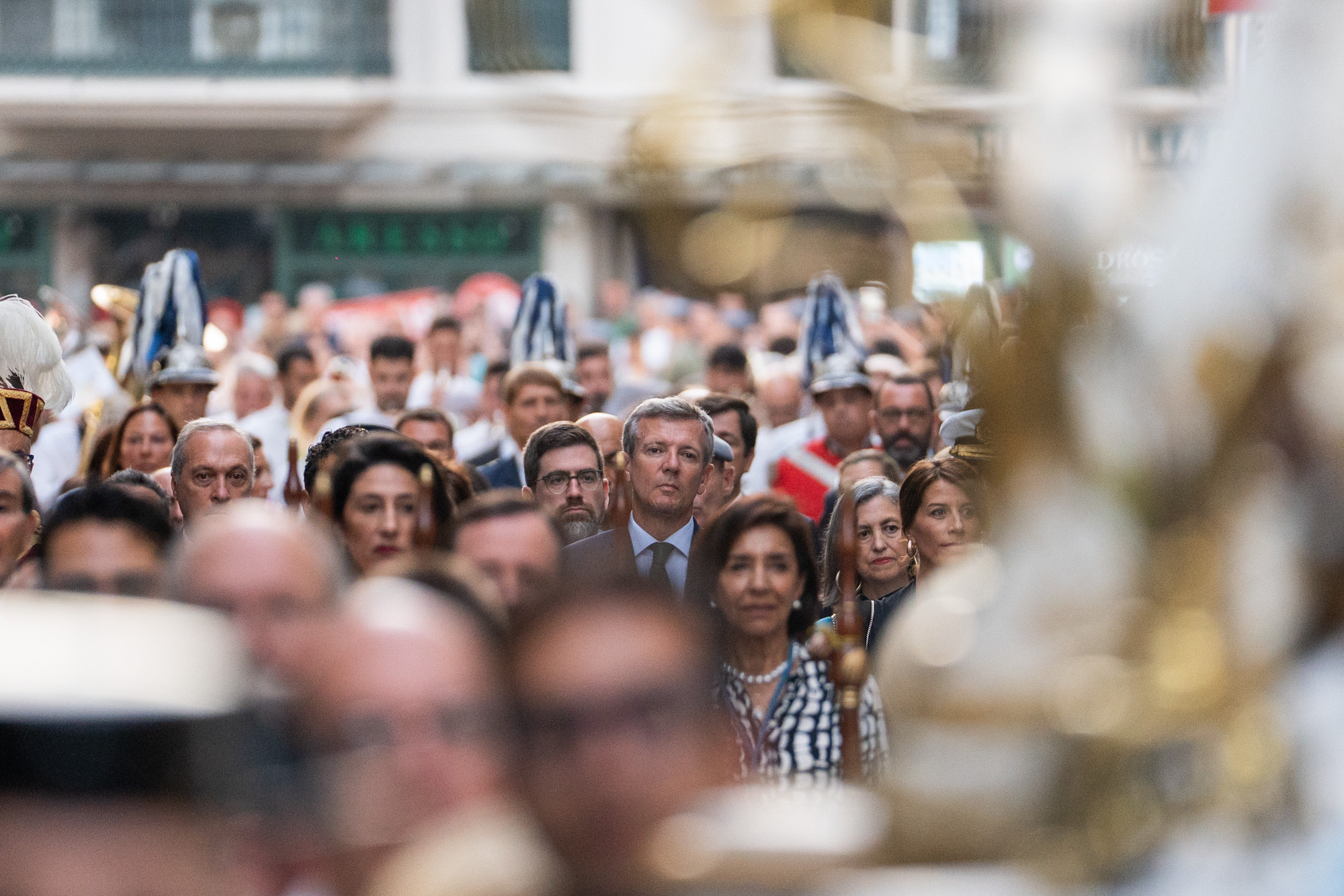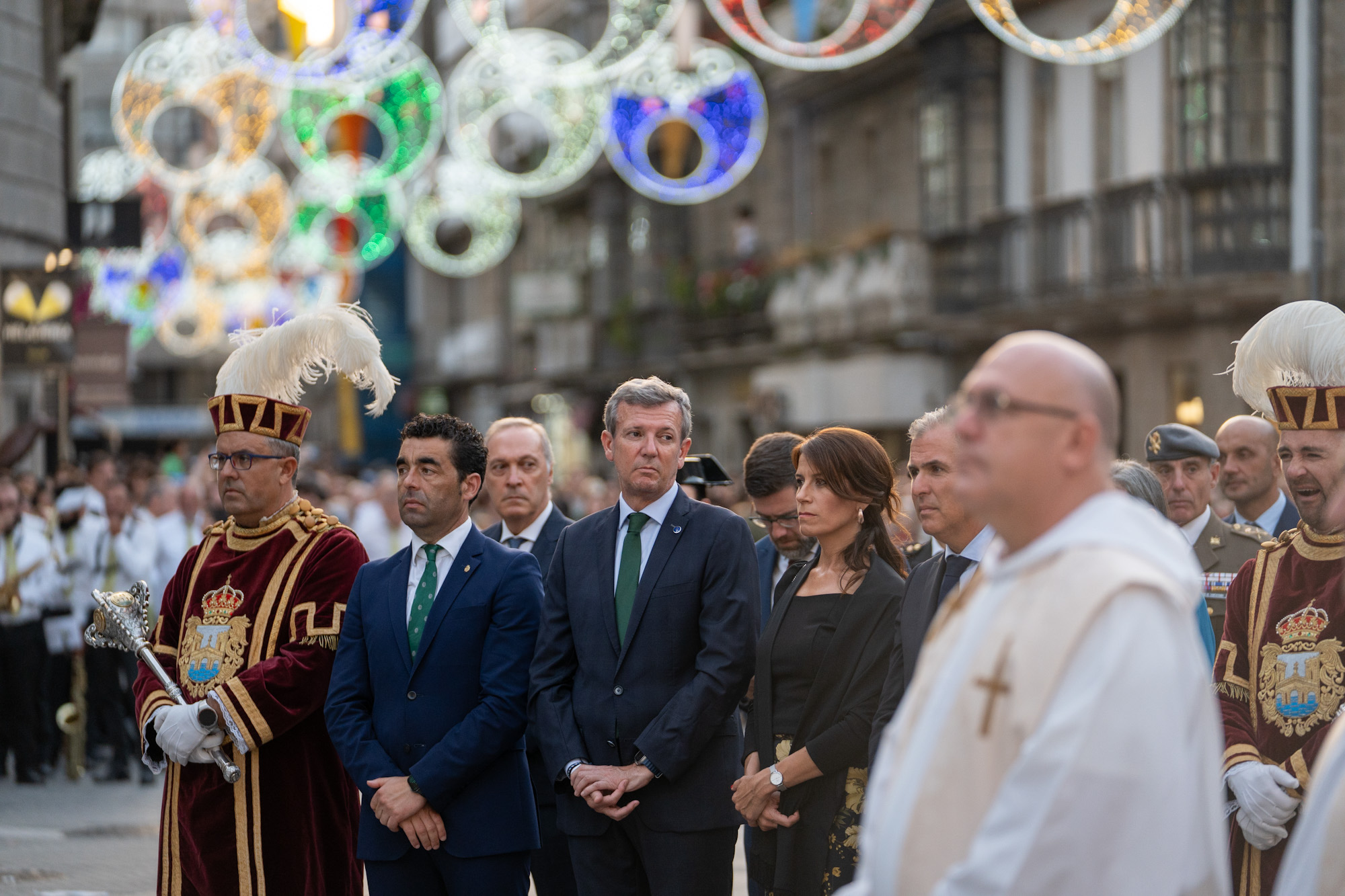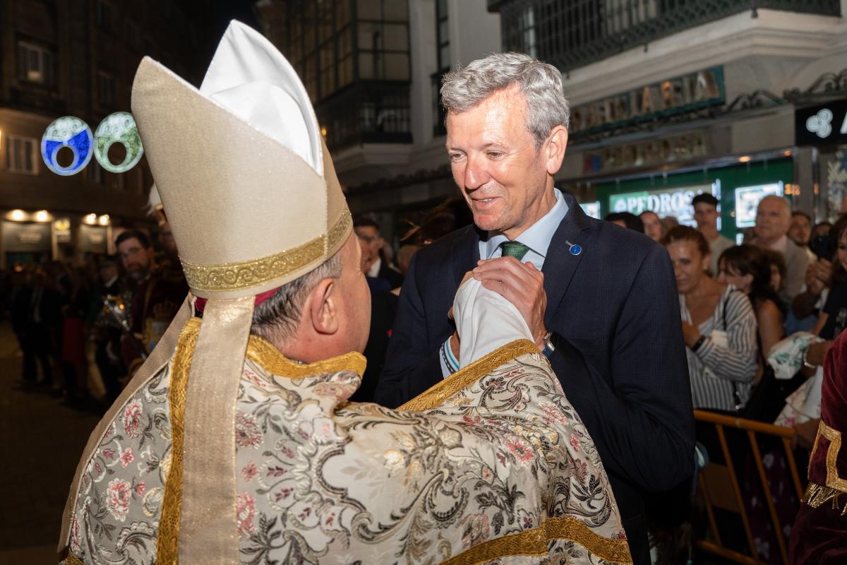 O titular do Executivo galego, Alfonso Rueda, acompañado pola conselleira de Vivenda e Planificación de Infraestruturas, María Martínez Allegue, participou na Solemne Procesión da Virxe Peregrina en Pontevedra.
